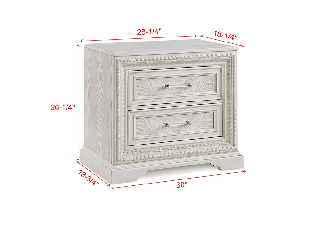 Introducing a bedroom collection that brings a breath of fresh sophistication to any living space. This suite boasts a bright,... Introducing a bedroom collection that brings a breath of fresh sophistication to any living space. This suite boasts a bright, antique white finish that immediately brightens and opens up a room, providing a versatile foundation for any decor style. The bed's commanding headboard stands as a stately centerpiece, with architectural paneling details that convey a sense of sturdy elegance. Storage needs are gracefully met by the dresser and chest, each accented with refined drawer pulls that offer a subtle contrast and easy access.Product Features Architectural paneling details Bookmatched veneer Acrylic pulls Alexandria - Accent Nightstand - White30.0"W x 18.75"D x 26.25"H - 56.1 lb View more