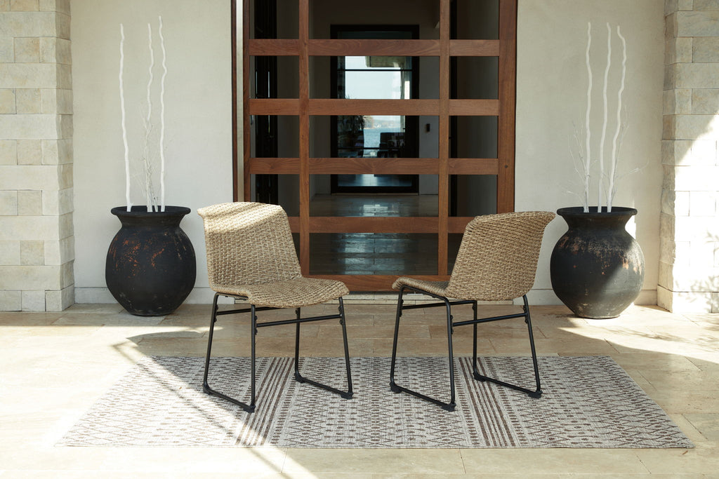 Powder coated steel frame. Resin wicker dining chairs and table. Resin wood look tabletop with umbrella hole. Black frame/tan wicker.... Powder coated steel frame. Resin wicker dining chairs and table. Resin wood look tabletop with umbrella hole. Black frame/tan wicker. Assembly required. Ashley Express. Amaris - Brown/Black - Round Dining Table Dimensions 42.25"W x 42.25"D x 29.38"H Weight 55 lbs Materials Amaris - Brown/Black - Chair (2/CN) Dimensions 18.38"W x 25.5"D x 31.25"H Weight 26 lbs Materials View more