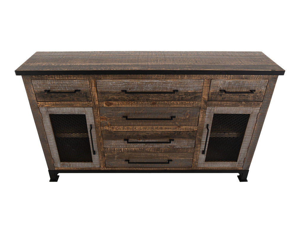 6 Drawer 2 Doors Buffet. The Antique Gray collection is meticulously crafted from solid pine wood, featuring a captivating hand-distressed... 6 Drawer 2 Doors Buffet. The Antique Gray collection is meticulously crafted from solid pine wood, featuring a captivating hand-distressed look in a multicolor finish. This collection serves as the perfect rustic addition to your home.Product Features Crafted of solid pine wood. Multi-step, soft multi-colored finish on hand distressed wood provides an antique look and added protection with nitrocellulose-based lacquer Mortise and tenon construction offers stability and durability. English dovetail on 100% solid wood drawer fronts. Hafele steel slides. Iron mesh panel doors equipped with magnetic catches. Metal hardware and base with non-chip finish in matte black. Antique - Buffet - Gray / Brown70.75"W x 15.25"D x 42.5"H - 165.0 lb View more