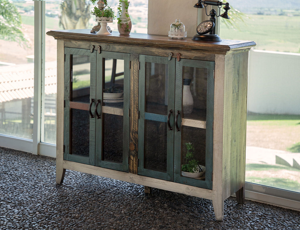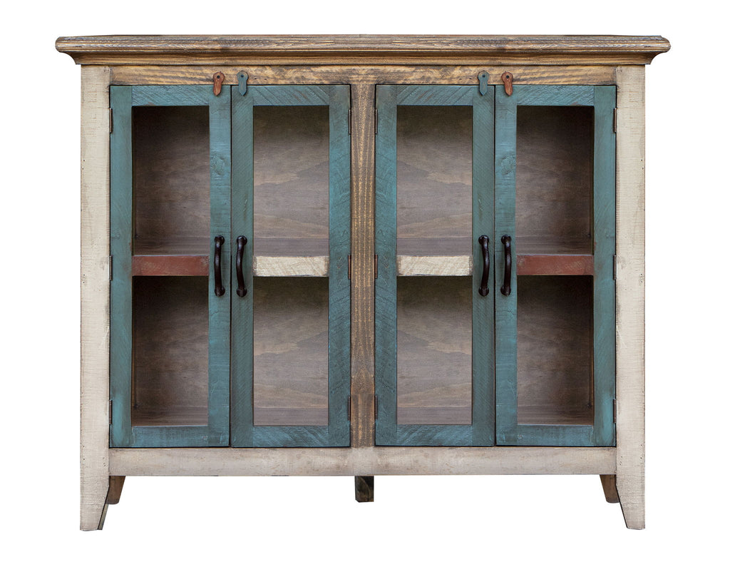 4 Glass Door 50" Console. The Antique collection is meticulously crafted from solid pine wood, featuring a captivating hand-distressed look... 4 Glass Door 50" Console. The Antique collection is meticulously crafted from solid pine wood, featuring a captivating hand-distressed look in a multicolor finish. This collection serves as the perfect rustic addition to your home.Product Features Crafted of solid pine wood. A multi-step, soft, multi-colored finish on hand-distressed wood. Mortise and tenon construction offers stability and durability. Glass doors equipped with magnetic catches. Metal pulls with non-chip finish. Fixed shelves behind glass doors. Antique - Console With 4 Glass Doors - Multicolor50.75"W x 16.5"D x 42.25"H - 84.0 lb View more