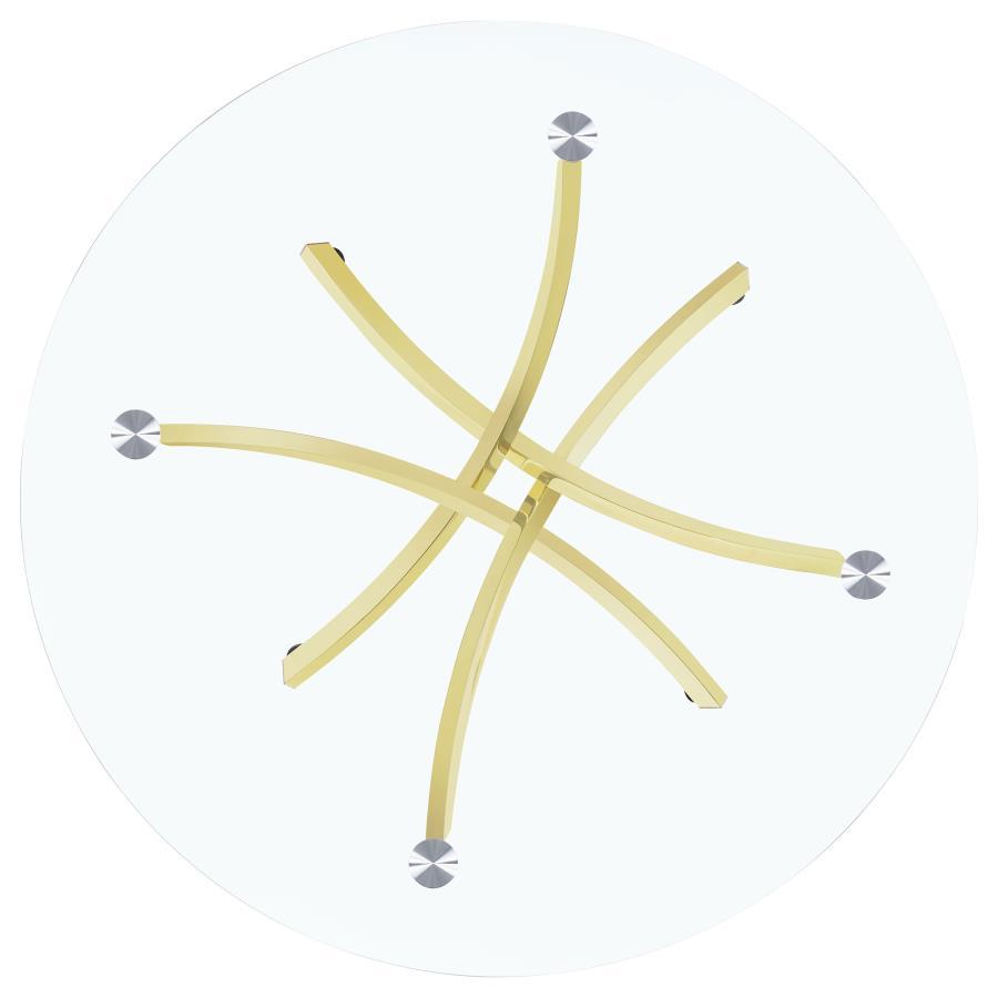 This round dining table offers a striking balance of clarity and form. A clear tempered glass top creates an airy... This round dining table offers a striking balance of clarity and form. A clear tempered glass top creates an airy presence, while the sculptural asterisk-style base adds dramatic visual interest. Crafted from heavy gauge metal, the base is electroplated in a reflective brass or chrome finish, providing a luxurious touch to its contemporary silhouette. A bold yet functional centerpiece for modern dining spaces. View more