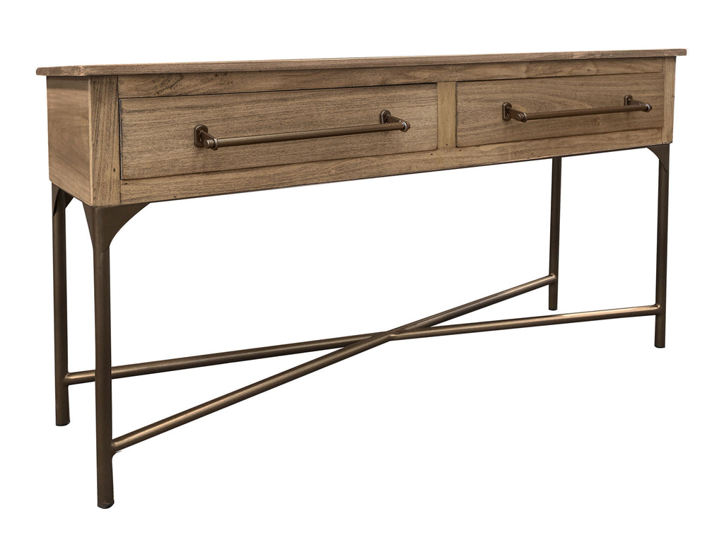 Metal Base Sofa Table. Experience the perfect harmony of simplicity and versatility with our Bernabe collection. Meticulously crafted, this collection seamlessly combines metal and solid pine wood, lightly distressed to accentuate its beautiful grain.