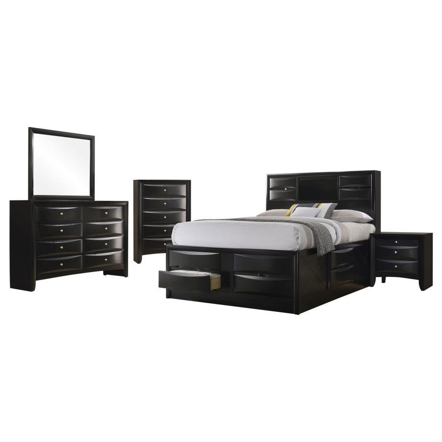 From the Briana collection comes this smooth, transitional style 5-piece bedroom set for a primary suite. The handsome storage bed offers function in the form of drawers in the footboard as well as storage compartments behind drop down doors in the headboard and right side. The chest, nightstand, and dresser are constructed with plenty of drawers with chambered edge fronts and brushed chrome knobs, affording ample storage space with added stylishness. The straight, clean rectangular mirror easily fits upon the stately dresser finish out the set. The entire set is finished in timeless black that's sure to match any home decor.