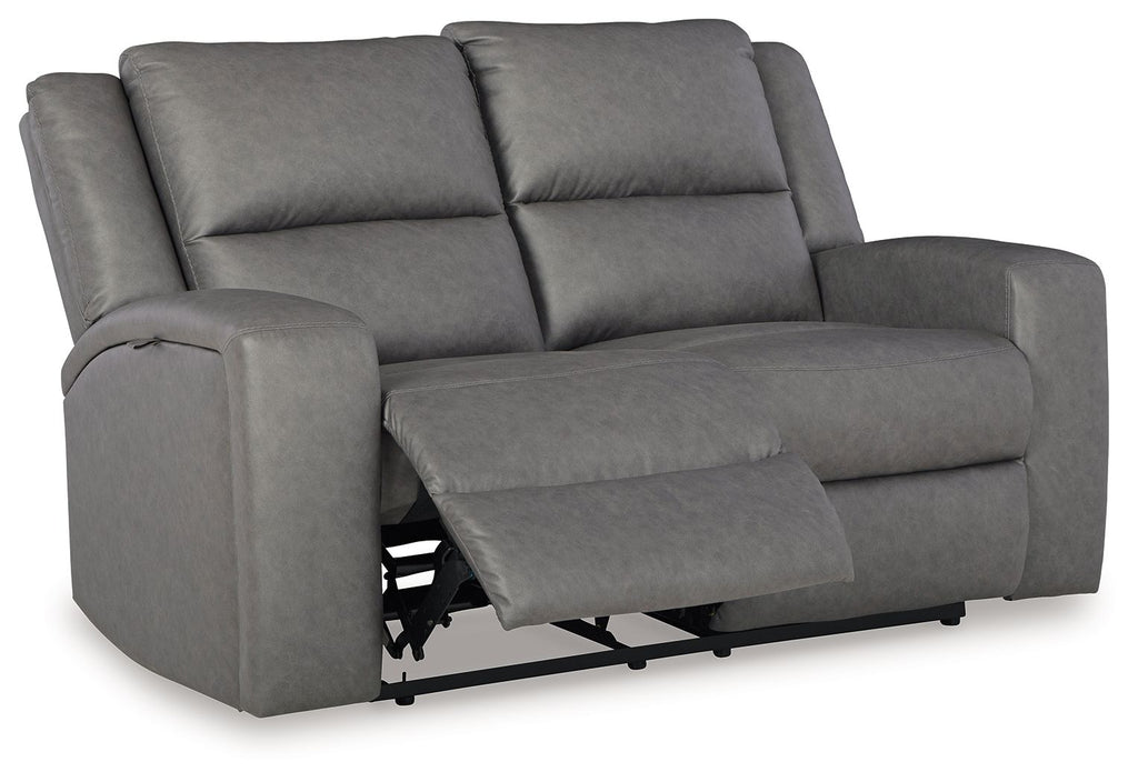 This reclining loveseat appeals to your love for feature-filled furniture, all while maintaining a clean-lined and contemporary design. Pop-out storage... This reclining loveseat appeals to your love for feature-filled furniture, all while maintaining a clean-lined and contemporary design. Pop-out storage and cup holders keep essentials close when you need them and tuck away easily when you don’t. Time to recline? A subtly placed handle extends the footrest with a simple pull. The sleekest of seating options, this loveseat expertly balances form and function.Additional Dimensions Arm height: 25" Distance between arms: 46" Seat depth: 23" Seat height: 20" Fully reclined length: 66" Distance between recliner and wall: 3" Footrest height: 19" Minimum width of doorway for delivery: 32" Product Features One-pull reclining motion Zero wall recliner design requires minimal space between wall and chair back Corner-blocked frame with metal reinforced seat Attached cushions High-quality foam cushions wrapped in poly fiber Faux leather upholstery Pop out storage and cup holder in each arm Brixworth - Reclining Loveseat - Slate63.0"W x 41.0"D x 40.0"H - 200.0 lb View more