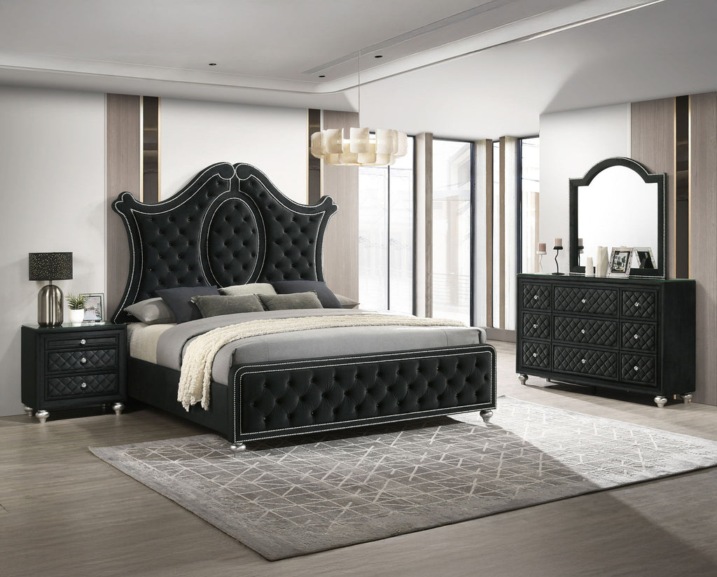 Indulge in timeless elegance and dramatic sophistication with this stunning bedroom collection, designed to make a bold statement. The centerpiece... Indulge in timeless elegance and dramatic sophistication with this stunning bedroom collection, designed to make a bold statement. The centerpiece features an exquisitely tufted headboard with luxurious upholstery and intricate nailhead trim, exuding opulence and grandeur. Coordinating pieces showcase diamond-patterned tufted accents, mirrored details, and polished hardware, blending classic design with modern glamour. With ample storage and impeccable craftsmanship, this ensemble offers both style and practicality, creating a lavish retreat that embodies refined comfort and striking aesthetics. Perfect for those seeking a bedroom that radiates luxury and charm. Cameo - King 4 Piece Bedroom Set - Gray447.53 lb Cameo - King 5 Piece Bedroom Set - Gray447.53 lb Cameo - Queen 4 Piece Bedroom Set - Gray427.69 lb Cameo - Queen 5 Piece Bedroom Set - Gray427.69 lb Cameo - King 4 Piece Bedroom Set - Black447.53 lb Cameo - King 5 Piece Bedroom Set - Black447.53 lb Cameo - Queen 4 Piece Bedroom Set - Black427.69 lb Cameo - Queen 5 Piece Bedroom Set - Black427.69 lb View more