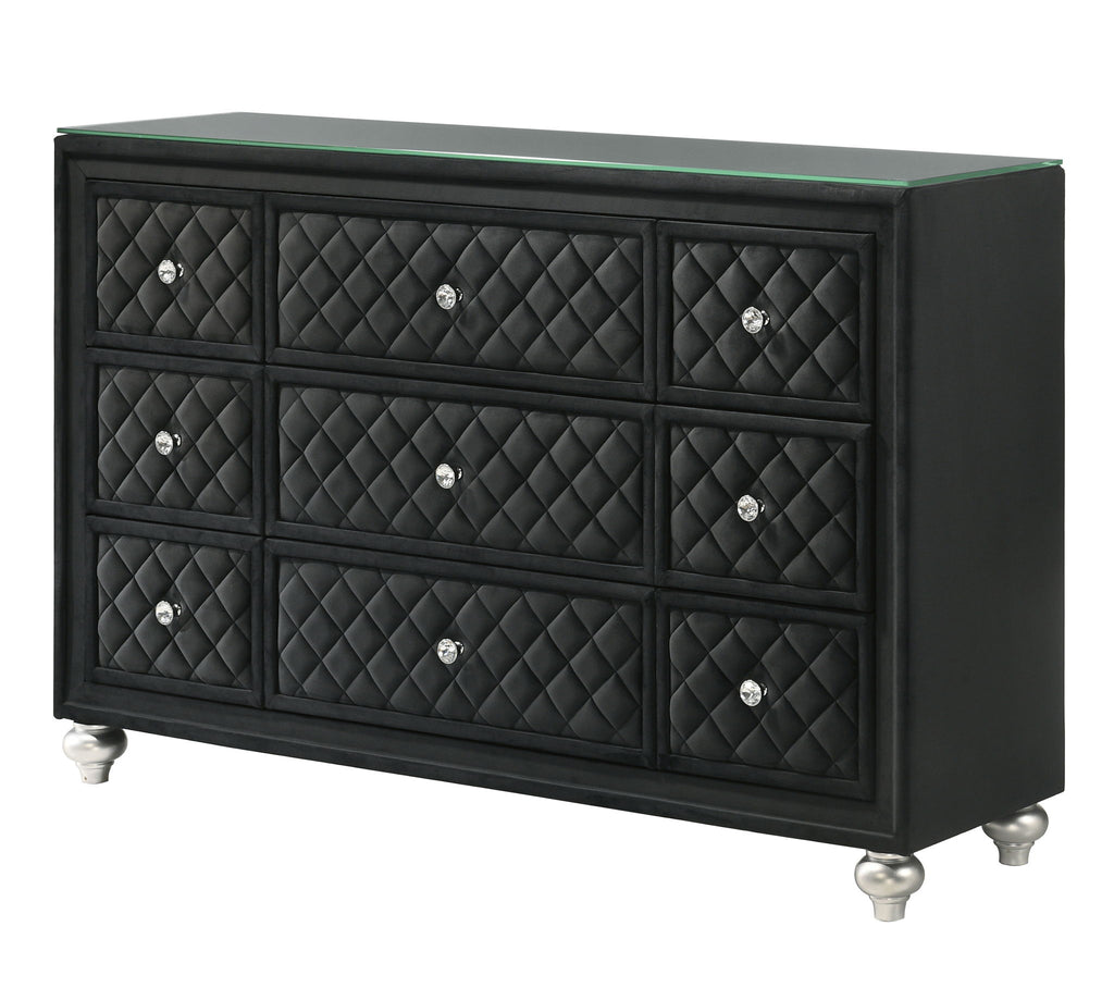 Indulge in timeless elegance and dramatic sophistication with this stunning bedroom collection, designed to make a bold statement. The centerpiece... Indulge in timeless elegance and dramatic sophistication with this stunning bedroom collection, designed to make a bold statement. The centerpiece features an exquisitely tufted headboard with luxurious upholstery and intricate nailhead trim, exuding opulence and grandeur. Coordinating pieces showcase diamond-patterned tufted accents, mirrored details, and polished hardware, blending classic design with modern glamour. With ample storage and impeccable craftsmanship, this ensemble offers both style and practicality, creating a lavish retreat that embodies refined comfort and striking aesthetics. Perfect for those seeking a bedroom that radiates luxury and charm. Cameo - Dresser & Mirror - Gray282.19 lb Cameo - Dresser & Mirror - Black274.47 lb View more