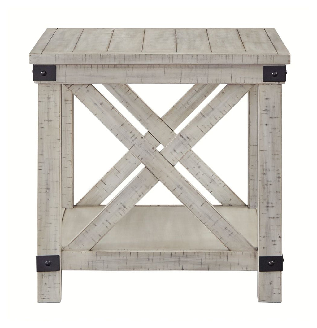 Sporting a distressed whitewash finish, this end table is rustic farmhouse living at its best. Crossbuck styling adds striking flair.... Sporting a distressed whitewash finish, this end table is rustic farmhouse living at its best. Crossbuck styling adds striking flair. Metal industrial brackets incorporate an industrial twist.Additional DimensionsOpening: 0"Product Features Made of pine wood, acacia veneer and engineered wood Distressed whitewash finish Metal bracket accents Crossbuck details Fixed lower shelf Assembly required Carynhurst - Rectangular End Table - Whitewash24.0"W x 26.0"D x 25.0"H - 44.0 lb View more
