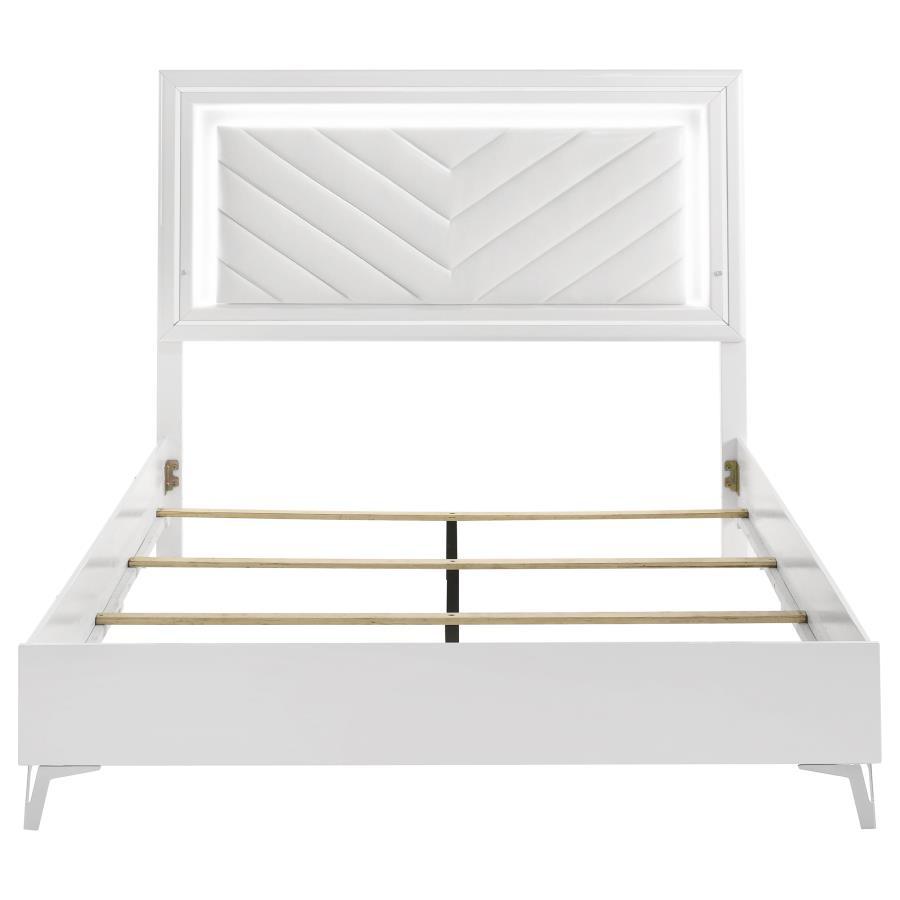 This modern bed showcases a high-gloss white frame paired with a bold LED-lit headboard for striking impact. The panel headboard features a white faux leather insert with chevron channel tufting, framed by a white LED trim that casts soft ambient light. Clean edges and chrome-finished legs enhance its sleek silhouette, while the low footboard keeps the focus on the illuminated design. A foundation is required to complete this stylish bedroom centerpiece.