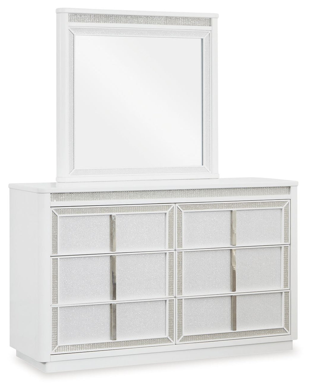 Transform your bedroom with this dresser and mirror. Its modern design and glamorous details create a sophisticated retreat. The built-in... Transform your bedroom with this dresser and mirror. Its modern design and glamorous details create a sophisticated retreat. The built-in LED lighting and rhinestone-framed drawers add style and practical storage. Let your sanctuary shine—and never let anyone dull your sparkle.Product Features Includes dresser and mirror Made with solid wood components, MDF substrate and decorative laminate White lacquer finish Vertical metal drawer pulls Built-in LED lighting with 3-way dimmer switch 6 drawers with fully finished interior, dovetail construction and heavy duty ball-bearing side glides Drawers with rhinestone frames; textured laminate drawer fronts Mirror attaches to back of dresser Power cord included; UL Listed View more