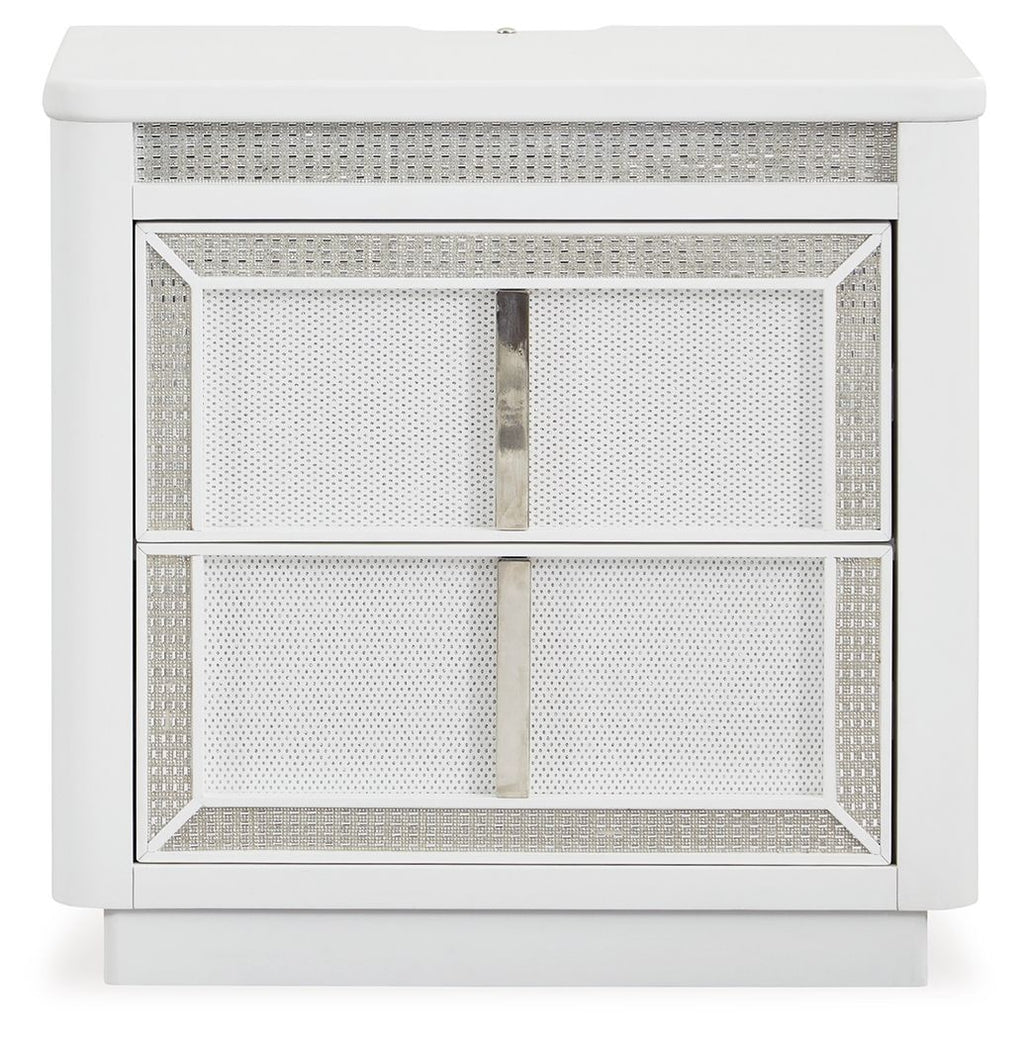 Transform your bedroom with this nightstand. Its modern design and glamorous details create a sophisticated retreat. The built-in LED lighting... Transform your bedroom with this nightstand. Its modern design and glamorous details create a sophisticated retreat. The built-in LED lighting and rhinestone-framed drawers add style and practical storage, while USB charging keeps you connected. Let your sanctuary shine and never let anyone dull your sparkle.Additional Dimensions Top drawer interior (lined): 0" Bottom drawer interior: 0" Cord length: 120" Product Features Made with solid wood components, MDF substrate and decorative laminate White lacquer finish Vertical metal drawer pulls Built-in LED lighting with 3-way dimmer switch 2 drawers with fully finished interior, dovetail construction and heavy duty ball-bearing side glides Drawers with rhinestone frames; textured laminate drawer fronts 110V power supply with USB-A and USB-C charging ports Power cord included; UL Listed Chalanna - Two Drawer Night Stand - White27.63"W x 19.25"D x 27.0"H - 90.0 lb View more