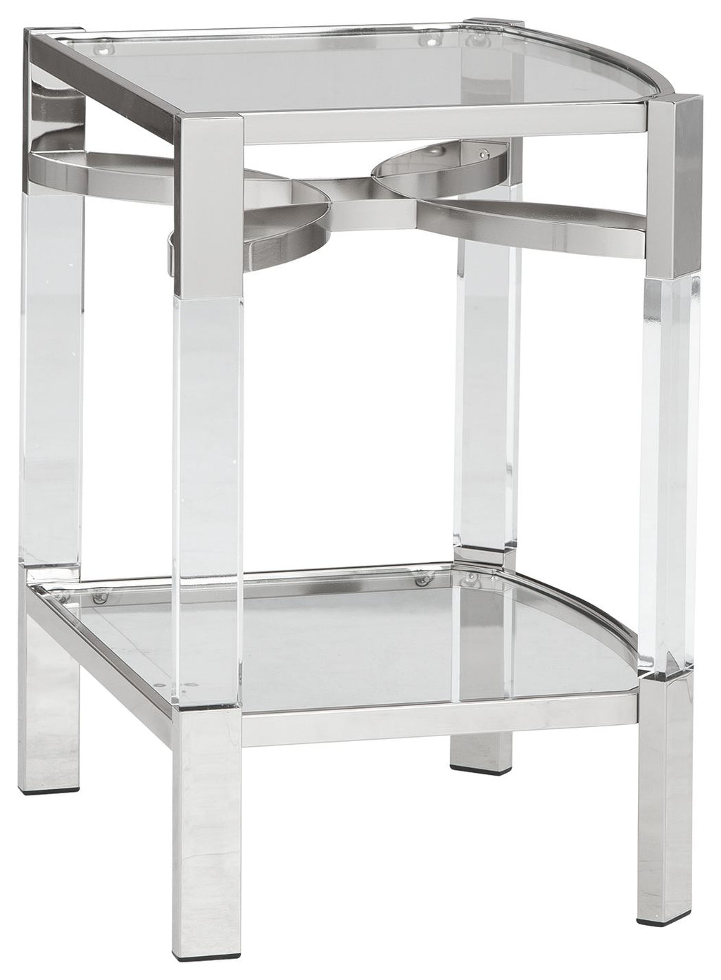 If you love the idea of total transparency, this accent table is surely a sight for sore eyes. Crafted of... If you love the idea of total transparency, this accent table is surely a sight for sore eyes. Crafted of clear acrylic, the glass top and open glass shelf is beautifully on trend. Sleek chrome plated metal legs with clear acrylic accents add a touch of elegance to your mid-mod vibe.Additional DimensionsOpening: 0"Product Features Made with acrylic, metal and glass Lower open shelf Chrome plated metal legs with clear acrylic accents Assembly required Chaseton - Accent Table - Clear / Silver Finish21.38"W x 18.0"D x 26.13"H - 26.0 lb View more