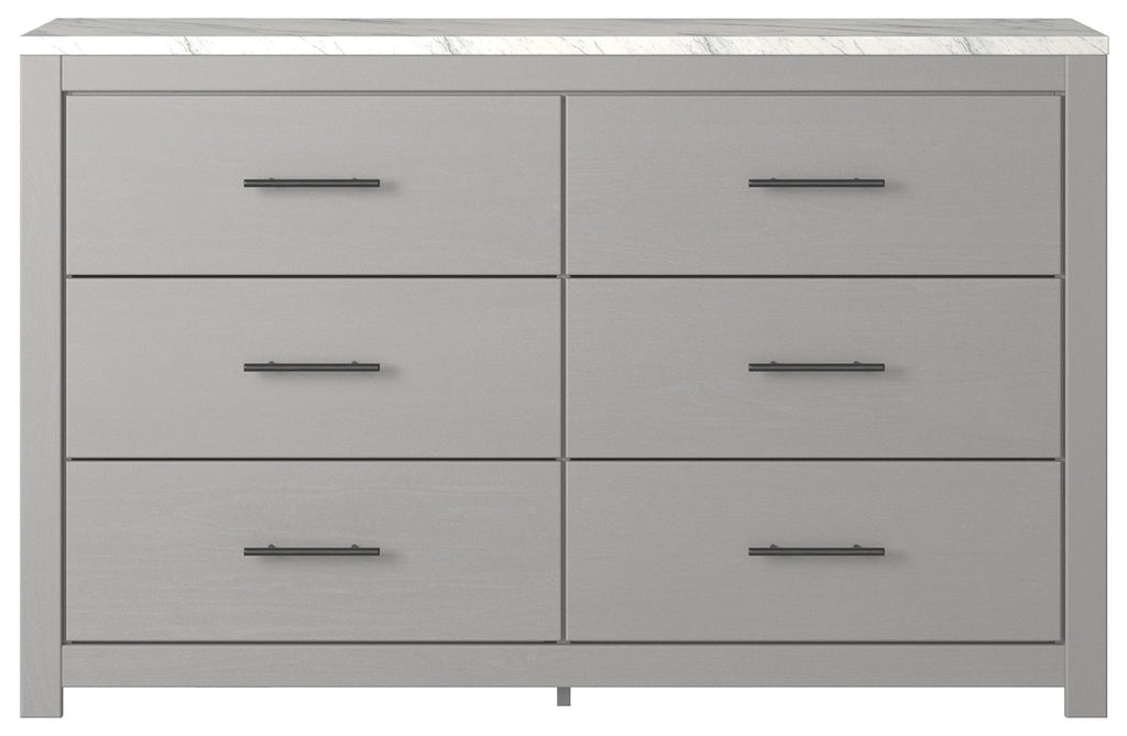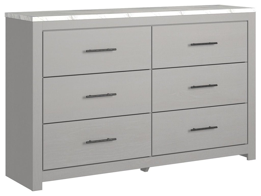 Cottonburg - Light Gray/White - Dresser 58.98"W x 15.59"D x 36.77"H - 145.0 lbs Cottonburg - Light Gray/White - Bedroom... Cottonburg - Light Gray/White - Dresser 58.98"W x 15.59"D x 36.77"H - 145.0 lbs Cottonburg - Light Gray/White - Bedroom Mirror 41.85"W x 1.3"D x 30.67"H - 24.0 lbs Wispy dove gray finish with replicated wood grain accented with a replicated Calcutta marble top. Cases feature a framed front and pilasters. Contemporary handles in a dark pewter color finish. Side roller glides for smooth operating drawers. Drawer interiors lined with a replicated linen design for a clean, finished look. Queen (71) and king (72) headboards can attach to a bolt-on metal bed frame B100-31 or B100-66 respectively. Lighted bed option (54,56,57,58,98,99) with an abstract design. Queen and king panel headboards (57,58) feature decorative modern sconce lights in a matte black finish with champagne colored accents. Safety is a top priority, clothing storage units are designed to meet the most current standard for stability, ASTM F 2057 (ASTM International). Drawers extend out to accommodate maximum access to drawer interior while maintaining safety. Cottonburg - Six Drawer Dresser - Light Gray / White58.98"W x 15.59"D x 36.77"H - 186.0 lb View more