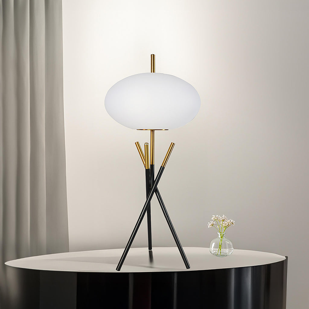 Transform your space with this bold and artistic lighting solution that seamlessly fuses minimalism with modern luxury. Featuring a sleek,... Transform your space with this bold and artistic lighting solution that seamlessly fuses minimalism with modern luxury. Featuring a sleek, tripod-style base in a striking black and gold finish, this lamp exudes a refined elegance. Its centerpiece is a smooth, frosted elliptical shade that casts a soft, ambient glow, creating a warm and inviting atmosphere. The dynamic contrast of the slim, angled rods and the gentle curves of the shade adds a touch of avant-garde charm. Perfect for adding a statement piece to any room, this design is both a functional light source and a work of art. View more