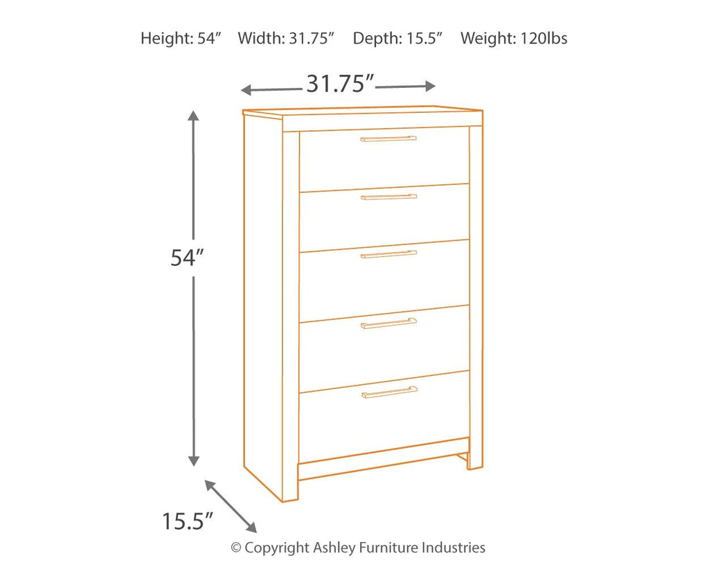 Modern yet hefty. This chest of drawers makes an urban eclectic statement. Seasoned raw wood look merges with the clean... Modern yet hefty. This chest of drawers makes an urban eclectic statement. Seasoned raw wood look merges with the clean lined design we love today. Muted rustic finish over replicated pine grain maintains its authenticity. Roomy drawers are flanked with attractive framed front and pilasters. Handles with antiqued gunmetal finish complete this beauteous look with easy to pull function.Additional Dimensions Bottom drawer interior (3): 0" Top drawer interior (2): 0" Product Features Made of engineered wood (MDF/particleboard) and decorative laminate Rustic butcher block finish over replicated pine grain with authentic touch Metal drawer pulls in antiqued gunmetal finish 5 smooth-gliding drawers with replicated linen interior Safety is a top priority, clothing storage units are designed to meet the most current standard for stability, ASTM F 2057 (ASTM International) Drawers extend out to accommodate maximum access to drawer interior while maintaining safety Assembly required Derekson - Five Drawer Chest - Multi Gray31.73"W x 15.31"D x 53.94"H - 159.0 lb View more