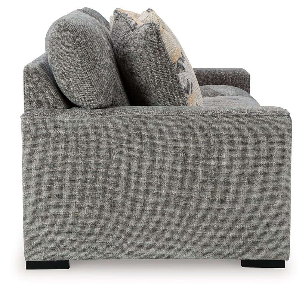 If reclining isn’t a priority (but curling up is), then this sofa is the clear choice for comfort. The deep... If reclining isn’t a priority (but curling up is), then this sofa is the clear choice for comfort. The deep seating and indulgently plush upholstery remind you to de-stress and take a break. When you want to have downtime in style, it's the best seat in the room.Additional Dimensions Arm height: 26" Distance between arms: 77" Seat depth: 27" Seat height: 23" Top of cushion to top of back: 18" Leg height: 1" Minimum width of doorway for delivery: 36" 24" Toss Pillow: 0" Product Features Corner-blocked frame Loose reversible seat and back cushions High-density foam cushions wrapped in feather-fiber blend jacket Accent pillows included Pillows with feather-fiber blend Polyester upholstery Exposed feet with faux wood finish Platform foundation system resists sagging 3x better than spring system after 20,000 testing cycles by providing more even support Smooth platform foundation maintains tight, wrinkle-free look without dips or sags that can occur over time with sinuous spring foundations Dunmor - Sofa - Graphite96.0"W x 45.0"D x 42.0"H - 206.0 lb View more