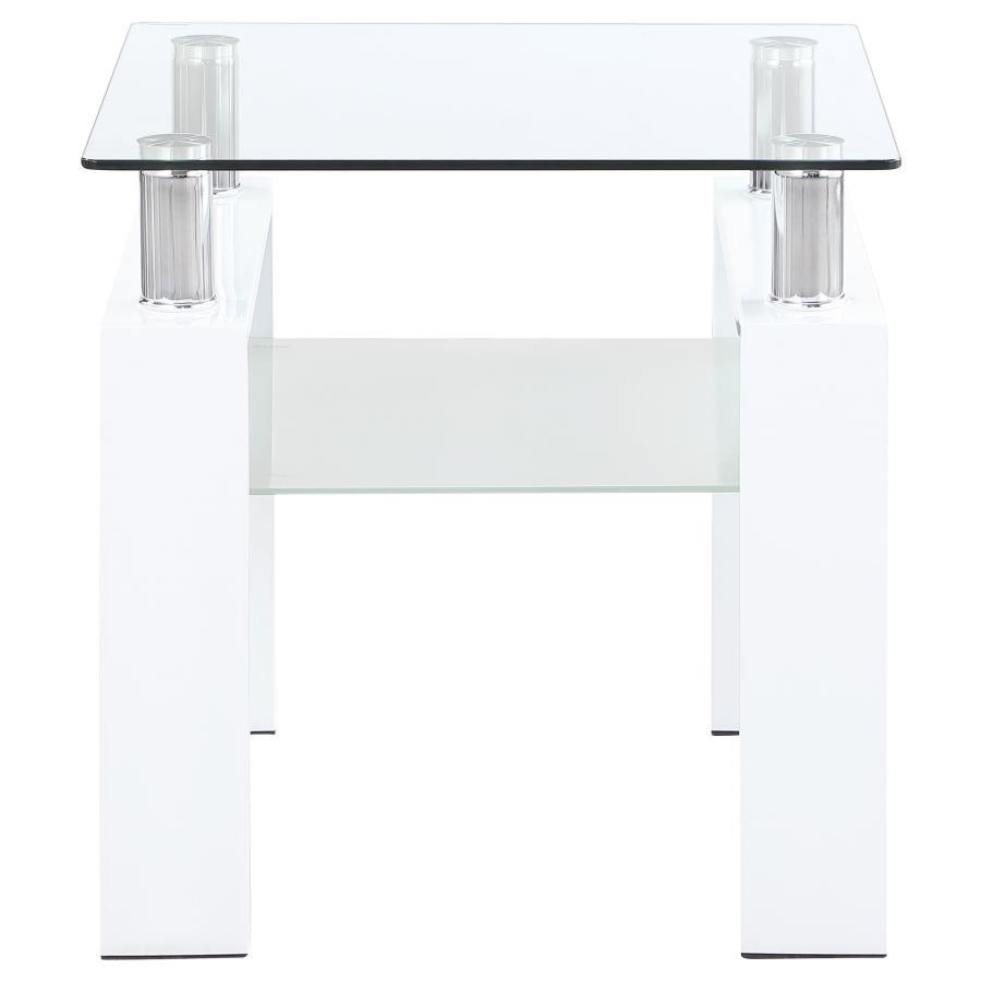 This square end table features a clear tempered glass top, complemented by a frosted tempered glass shelf for added storage... This square end table features a clear tempered glass top, complemented by a frosted tempered glass shelf for added storage or display. Supported by a sturdy metal frame, this piece combines both form and function. Its sleek design offers a modern look that suits a variety of contemporary living spaces. Whether used for storage or as an accent, this end table seamlessly blends with your home decor while providing a clean, open aesthetic. View more