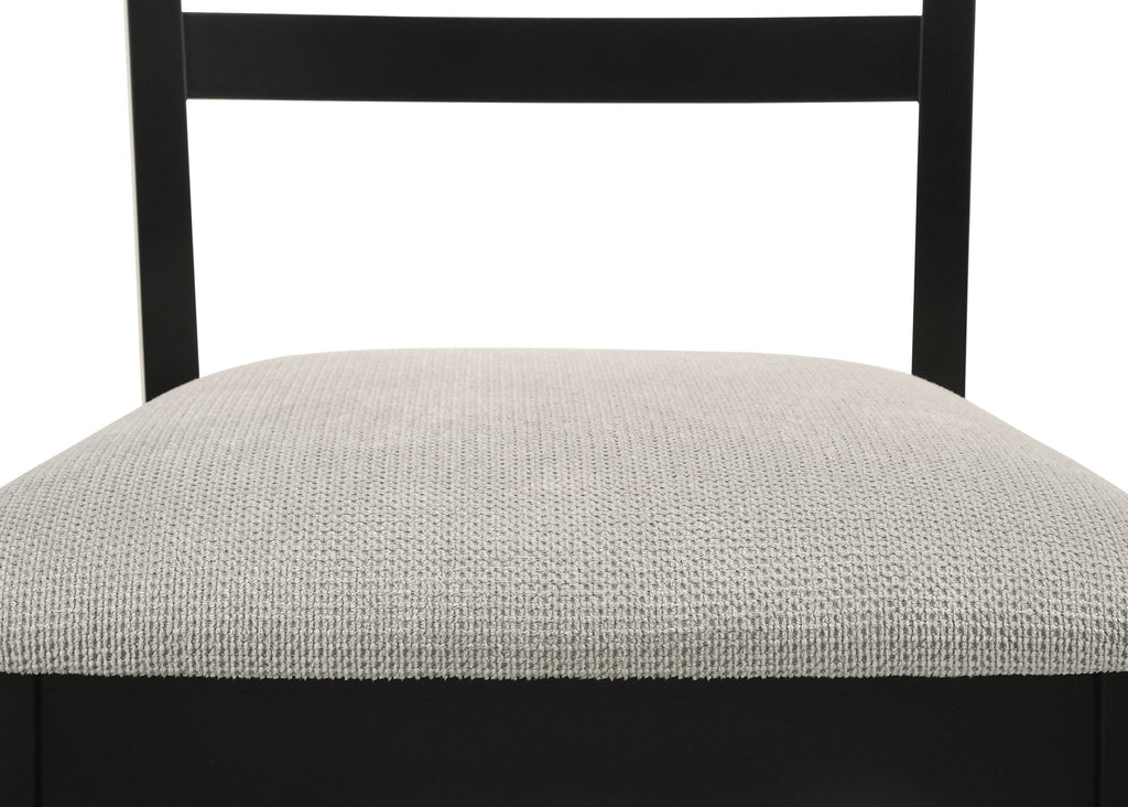 This dining group is the epitome of modern sophistication and functional elegance. The centerpiece is a sleek, rectangular table with... This dining group is the epitome of modern sophistication and functional elegance. The centerpiece is a sleek, rectangular table with a beautifully textured wood grain finish, offering a touch of rustic charm to its contemporary design. The table is complemented by a set of four ladder-back chairs and a versatile bench, all featuring a deep black frame that provides a striking contrast to the neutral, upholstered seats. The cushioned seating ensures comfort, while the bench adds flexibility and a communal feel, perfect for both family meals and entertaining guests. The overall design is enhanced by clean lines and a minimalist aesthetic, making this set a stylish focal point for any dining space.Product Features Solid wood legs Upholstered seat Slatted back design Folio - Side Chair (Set of 2) - Black / Gray19.29"W x 22.44"D x 39.0"H - 33.0 lb View more