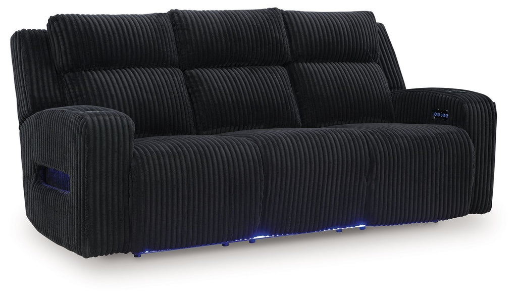 Trend-right style, meet irresistible modern function. Your living room gets a cozy-cool upgrade with this power reclining sofa. Curl up... Trend-right style, meet irresistible modern function. Your living room gets a cozy-cool upgrade with this power reclining sofa. Curl up in its ultra-chic corded upholstery and recline with one-touch controls. Is it movie night or game time? With ambient LED lighting and wireless audio connectivity, this sofa transforms from a serene relaxation spot to an entertainment hub. Its drop-down table, USB charging and cup holders make lounging all the more convenient.Additional Dimensions Arm height: 26" Distance between arms: 71" Seat depth: 24" Seat height: 20" Fully reclined length: 68" Distance between recliner and wall: 6" Footrest height: 19" Minimum width of doorway for delivery: 32" Forest Lake - Power Reclining Sofa With Adj Headrest - Black89.0"W x 44.0"D x 42.0"H - 283.0 lb Forest Lake - Power Reclining Sofa With Adj Headrest - Alloy89.0"W x 44.0"D x 42.0"H - 283.0 lb View more