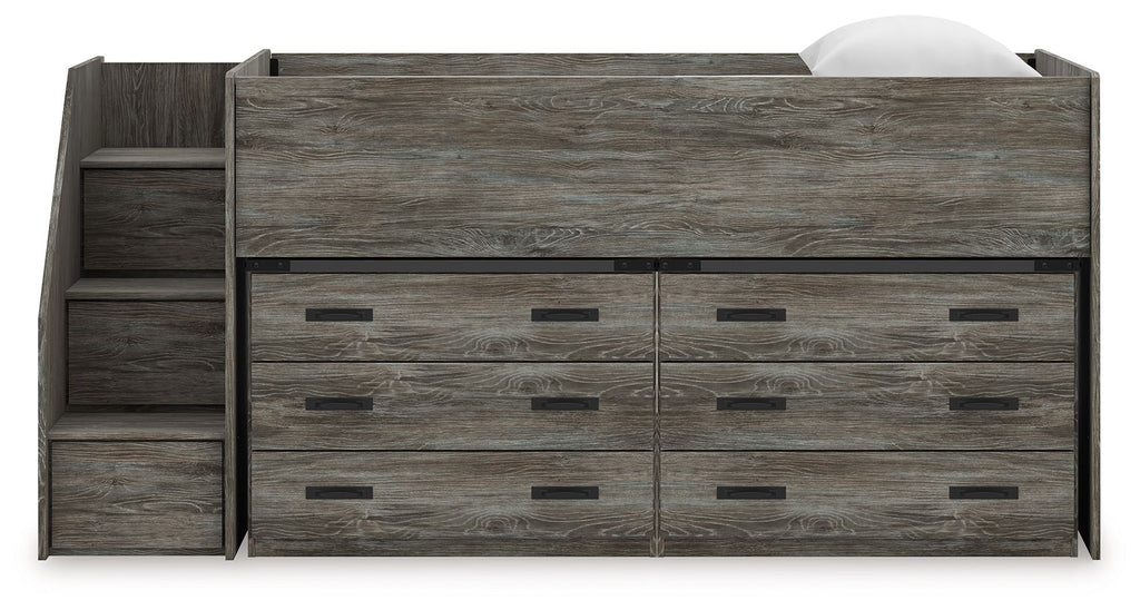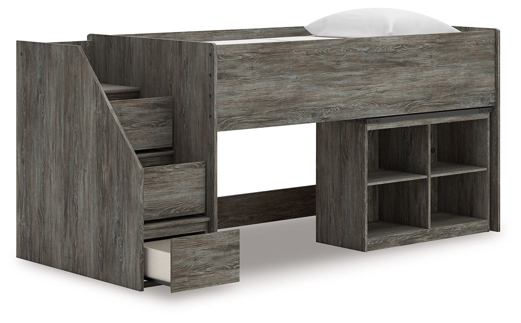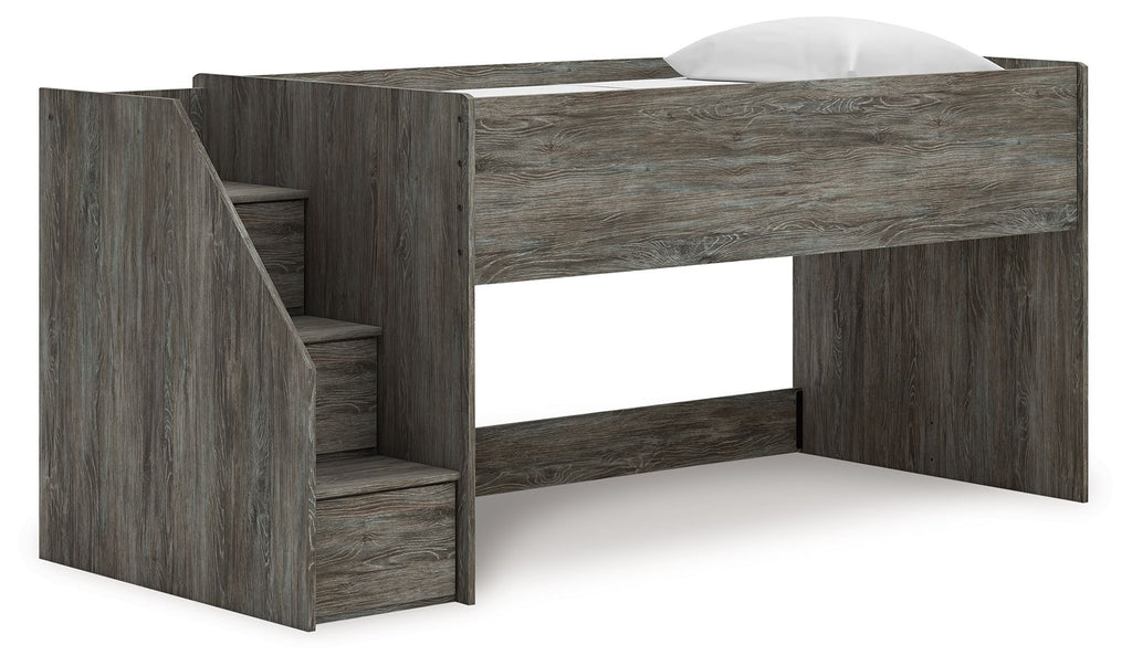 Cool, casual style is for all ages. With this loft bed with drawer storage, they get the function they need... Cool, casual style is for all ages. With this loft bed with drawer storage, they get the function they need plus with the refined design you love. Approachably neutral in a rustic warm, it’s adaptable enough to pair with an assortment of existing colors and room decor. Faux metal detailing with nailhead accents lends an industrial edge. And with its included drawers and bookcase, this space-saving bed doubles as a storage solution for clothes, books and everything in between. Frandern - Twin Loft Bed With Left Storage Steps - Gray94.75"W x 41.5"D x 43.54"H - 284.0 lb Frandern - Twin Loft Bed With Bookcase Storage - Gray94.75"W x 41.5"D x 43.54"H - 348.0 lb Frandern - Twin Loft Bed With Drawer Storage - Gray94.75"W x 41.5"D x 43.54"H - 360.0 lb Frandern - Twin Loft Bed With Bookcase And Drawer Storage - Gray94.75"W x 41.5"D x 43.54"H - 424.0 lb Frandern - Twin Loft Bed With 2 Bookcase Storages - Gray94.75"W x 41.5"D x 43.54"H - 412.0 lb Frandern - Twin Loft Bed With 2 Drawer Storages - Gray94.75"W x 41.5"D x 43.54"H - 436.0 lb View more