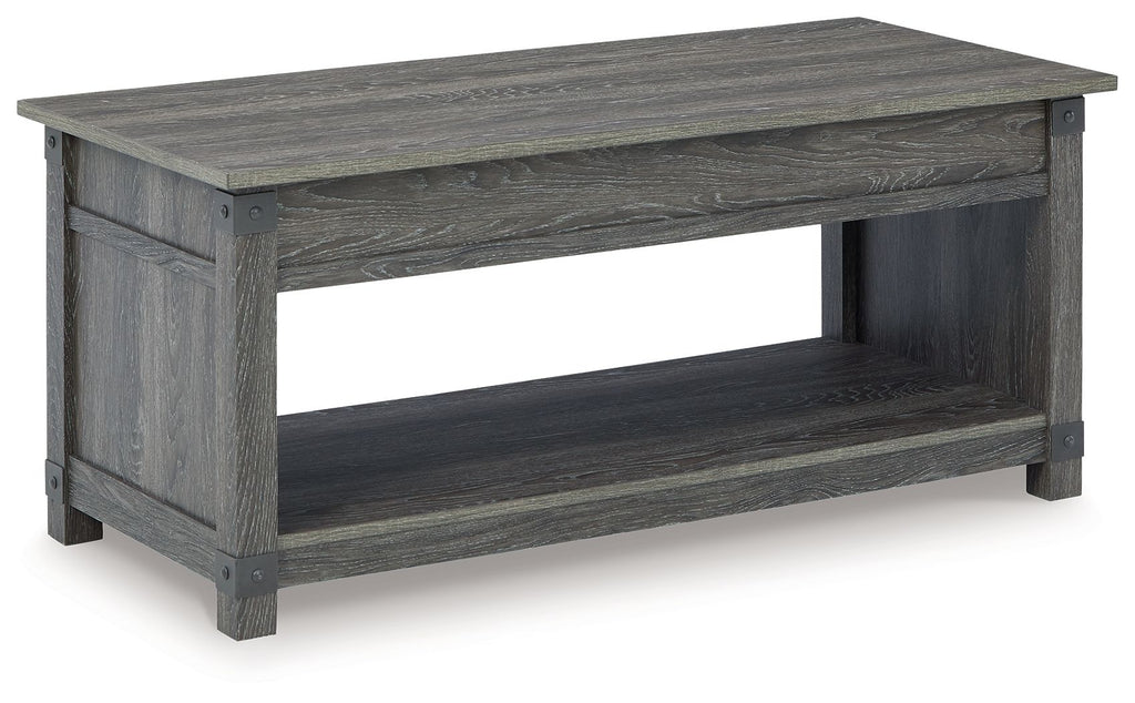 Open the door to modern farmhouse style with this lift-top coffee table. The beautiful woodgrain look and classic crossbuck metal accents are a cool touch, while the lower shelf provides surface space for fashionable home accessories. Sporting a gray replicated wood grain effect, its handy spring-loaded mechanism brings the tabletop closer to you. This versatile table makes it easier than ever to eat, work or play from the comfort of your sofa.
