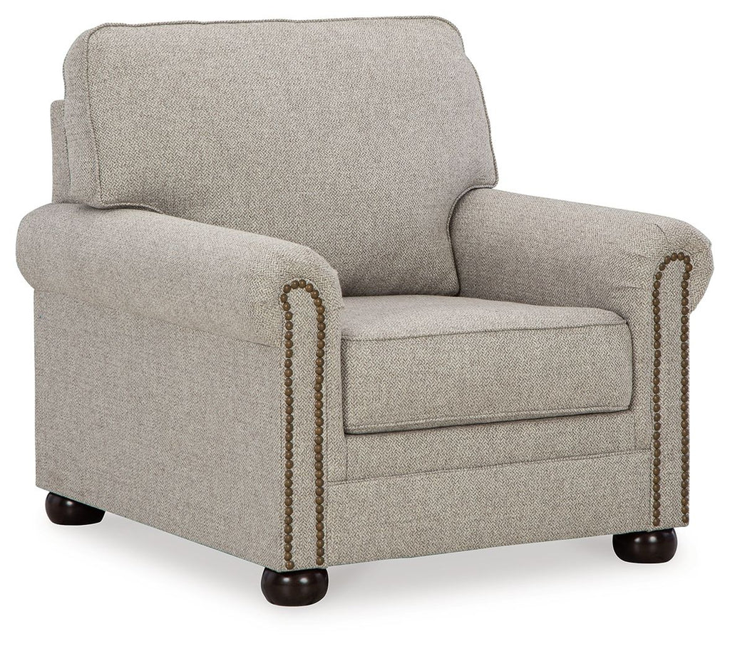 Inspired by the past but rooted firmly in the present, this chair complements your transitional seating area. Its versatile upholstery... Inspired by the past but rooted firmly in the present, this chair complements your transitional seating area. Its versatile upholstery is delightfully detailed for a subtle herringbone effect. Designer touches like decorative nailhead trim and bun legs add traditional character. With this chair’s reliable style and comfort, all you need to do is sit back and relax.Additional Dimensions Arm height: 25" Distance between arms: 23" Seat depth: 23" Seat height: 19" Top of cushion to top of back: 19" Leg height: 2.5" Minimum width of doorway for delivery: 32" Product Features Corner-blocked frame Attached back and loose seat cushions High-quality foam cushions wrapped in poly fiber Polyester upholstery Decorative bun legs Platform foundation system resists sagging 3x better than spring system after 20,000 testing cycles by providing more even support Smooth platform foundation maintains tight, wrinkle-free look without dips or sags that can occur over time with sinuous spring foundations Gaelon - Chair - Dune38.0"W x 41.0"D x 39.0"H - 114.0 lb View more