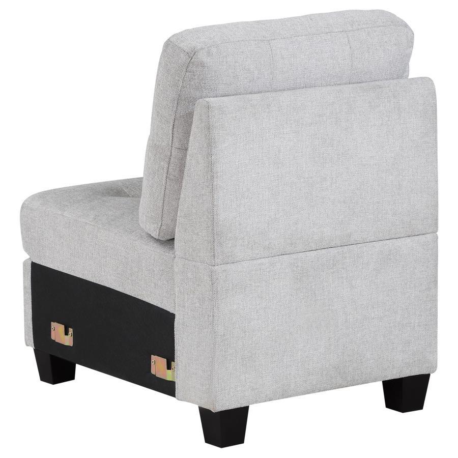 Build the sectional that suits your space with a modern armless chair. In soft beige upholstery, it's the perfect way to extend your Georgina collection sectional sofa, adding length to suit your living room. The chair features tufted cushions and sinuous spring decking under the seat, offering impressive comfort and support. Legs are a black finish tapered block style, complementing surrounding decor while offering stability and support. This sectional piece is constructed with rubberwoods and plywood for optimal strength and durability.