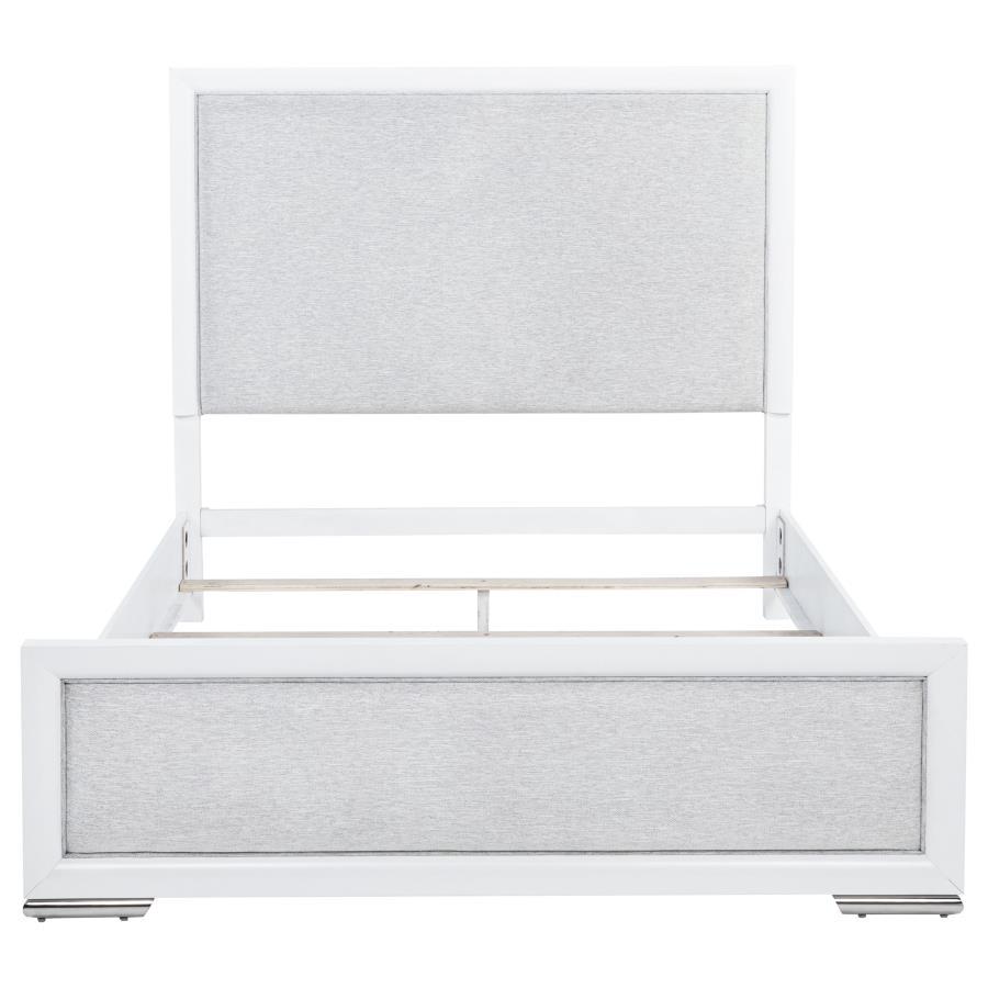 This panel bed pairs crisp framing with soft textures for a look that feels both refined and restful. The panel-style headboard and footboard are upholstered in light grey fabric with subtle herringbone texture, bordered by a clean white frame and finished with brushed nickel feet. Crafted from solid rubberwood, engineered wood, and foam padding, it offers visual contrast and supportive comfort. Foundation required.
