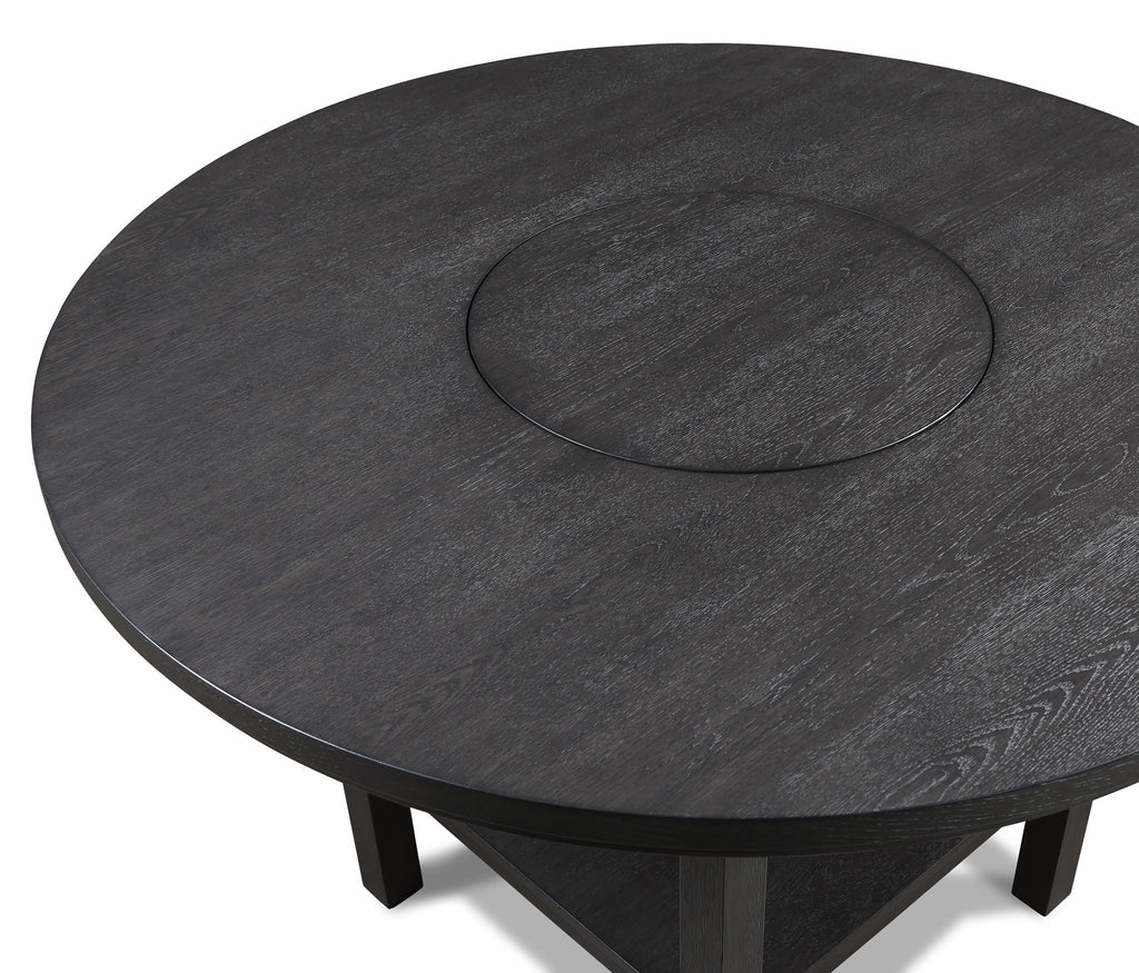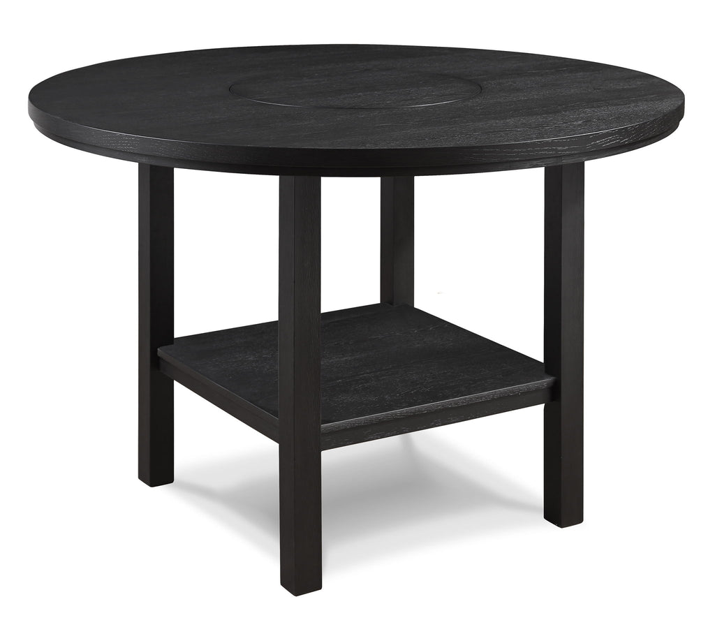 Elevate your dining experience with this contemporary dining group, where modern design meets rustic charm. Crafted with a rich, dark... Elevate your dining experience with this contemporary dining group, where modern design meets rustic charm. Crafted with a rich, dark finish, the round table offers a built in turntable and an open shelf below. The subtle grain detailing on the table's surface adds depth and character. Complementing the table are the sleek, slat-back chairs, designed for comfort and style with their plush upholstered seats.Guthrie - Counter Height Round Table With Lazysusan - Charcoal Dimensions 54"L x 54"D x 36.25"H Weight 99.00 lbs Guthrie - Counter Height Chair (Set of 2) - Charcoal & Gray Dimensions 18.25"L x 17.75"D x 42"H Weight 39.60 lbs Product Features Built in turntable Open shelf Solid wood legs Upholstered seat Triple slat back View more