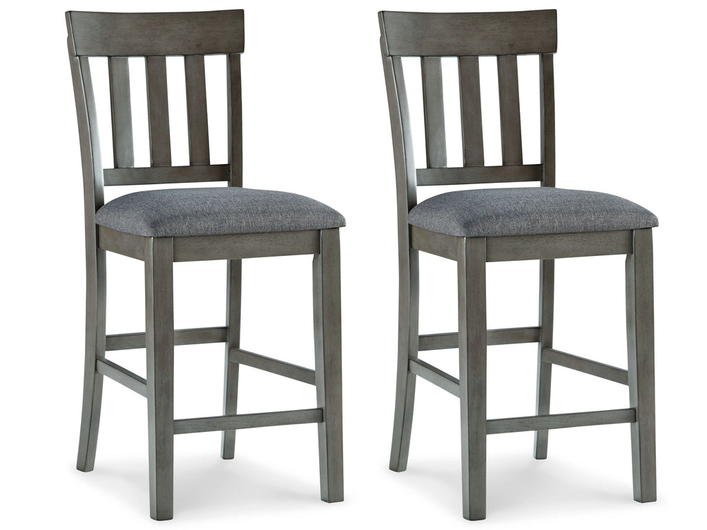 Cool and on-trend. This upholstered barstool sports a two-tone gray look for a contemporary-yet-casual feel. The cushioned foam seat in... Cool and on-trend. This upholstered barstool sports a two-tone gray look for a contemporary-yet-casual feel. The cushioned foam seat in a gray textural fabric pairs seamlessly with the antiqued gray finish, while the contoured comb-back design adds a dash of geometric flair. With this chic seat, it’s easy to dine in style.Additional Dimensions Seat width: 18.13" Seat depth: 18.38" Seat height: 25.63" Footrest height: 8" Product Features Made with solid wood Antiqued gray finish Upholstered in gray textural polyester fabric Cushioned foam seat Contoured comb-back design Assembly required Hallanden - Upholstered Barstool (Set of 2) - Black / Gray18.13"W x 21.25"D x 40.63"H - 20.5 lb View more