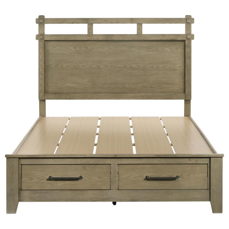 This platform storage bed blends graceful simplicity with practical function. A vineyard oak finish highlights the embossed oak grain across... This platform storage bed blends graceful simplicity with practical function. A vineyard oak finish highlights the embossed oak grain across rubberwood and engineered wood veneer. The headboard features framed platforming with open slat detail for added visual lightness. Two footboard drawers provide concealed storage, supported by durable center metal glides. A warm transitional style, this bed balances everyday utility with natural wood textures and quiet charm. View more