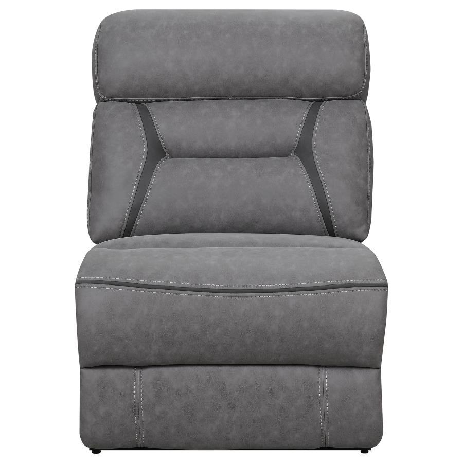 Designed for seamless modular integration, this armless chair expands seating space while maintaining a sleek and cohesive look. Upholstered in soft grey microfiber, it features plush padding and a supportive channel-tufted backrest for enhanced comfort. The armless design allows for flexible configuration within a sectional layout. Built for durability, it ensures long-lasting stability and a cozy seating experience.