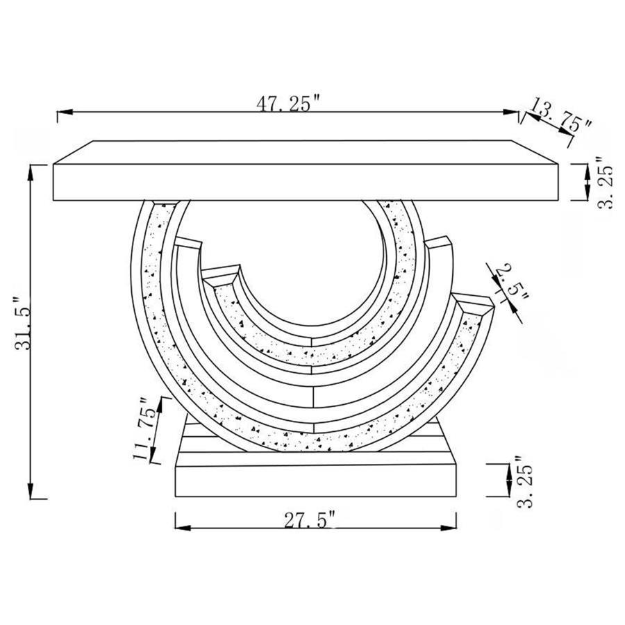 Make a dramatic statement with this glitzy mirrored console table, designed to dazzle from every angle. Its curved, swirl-inspired base... Make a dramatic statement with this glitzy mirrored console table, designed to dazzle from every angle. Its curved, swirl-inspired base creates a stunning three-dimensional look, adorned with smoke grey faux gemstones for extra sparkle. A mirrored tabletop and base amplify the shine, while the silver finish adds a sleek, modern touch. Perfect for adding glam to an entryway or living room. View more