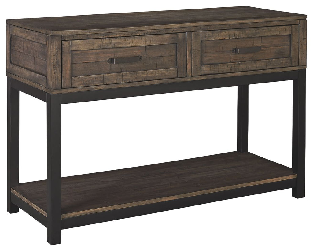 Combining a two-tone finish with a gently distressed texture produces one very distinctive sofa table. Whether your style is modern... Combining a two-tone finish with a gently distressed texture produces one very distinctive sofa table. Whether your style is modern farmhouse or urban industrial, the Johurst sofa table is the perfect accent for your rustic retreat.Additional Dimensions Drawer interior (2): 0" Opening: 0" Product Features Made of wood, veneers and engineered wood Rustic two-tone finish; distressed brown and black metallic 2 smooth-gliding drawers Aged bronze-tone pulls Lower fixed shelf Johurst - Sofa Table - Grayish Brown48.0"W x 18.13"D x 32.25"H - 100.0 lb View more