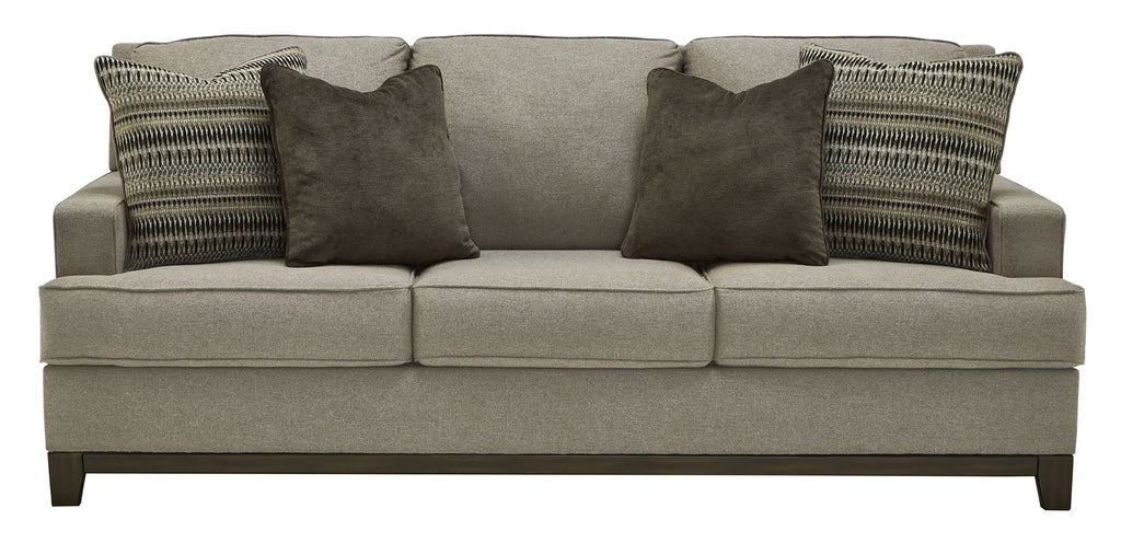 Whether your style is American classic, contemporary or an eclectic mix, this beautifully versatile sofa is sure to look right... Whether your style is American classic, contemporary or an eclectic mix, this beautifully versatile sofa is sure to look right at home. Distinctive elements include an exposed rail, designer accent pillows and decadent woven upholstery in a rich neutral shade inspired by tailored menswear.Additional Dimensions Arm height: 26" Distance between arms: 77" Seat depth: 21" Seat height: 21" Top of cushion to top of back: 19" Leg height: 5" Minimum width of doorway for delivery: 36" 24" Toss Pillow: 0" 22" Toss Pillow: 0" Product Features Corner-blocked frame Attached back and loose seat cushions High-quality foam cushions wrapped in poly fiber Polyester upholstery and pillows Throw pillows included Pillows with soft polyfill Exposed rail and feet with faux wood finish Platform foundation system resists sagging 3x better than spring system after 20,000 testing cycles by providing more even support Smooth platform foundation maintains tight, wrinkle-free look without dips or sags that can occur over time with sinuous spring foundations Kaywood - Sofa - Granite89.0"W x 40.0"D x 38.0"H - 148.0 lb View more