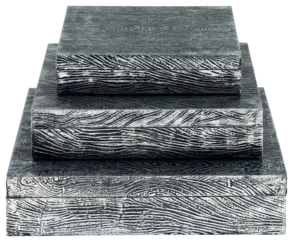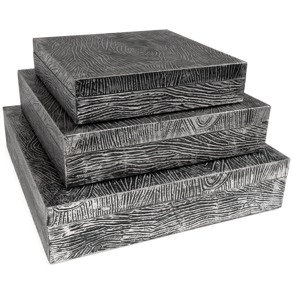 Ideal for a dresser, chest or accent table, this set of three wood and metal boxes is a contemporary choice... Ideal for a dresser, chest or accent table, this set of three wood and metal boxes is a contemporary choice for the forward-thinking modernist. Keldy - Box Set (Set of 3) - Antique Brass Finish12.88"W x 12.88"D x 3.38"H - 7.0 lb Keldy - Box Set (Set of 3) - Antique Pewter Finish12.88"W x 12.88"D x 3.38"H - 8.0 lb View more