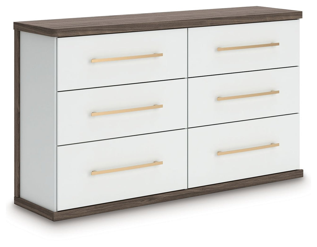 Looking to make a subtly striking statement in your bedroom? We've got you covered. This dresser's sophisticated two-tone treatment marries... Looking to make a subtly striking statement in your bedroom? We've got you covered. This dresser's sophisticated two-tone treatment marries a warm finish over replicated walnut grain with a matte white finish. Rounded corners and a thick top radiate an air of modern panache, while sleek handles in a champagne finish add a sparkling touch to the spacious drawers. It’s a master class in contemporary yet comfortable character. Kendanport - Six Drawer Dresser - Brown / White60.43"W x 15.55"D x 34.96"H - 195.0 lb Kendanport - Dresser And Mirror - Brown219.0 lb View more