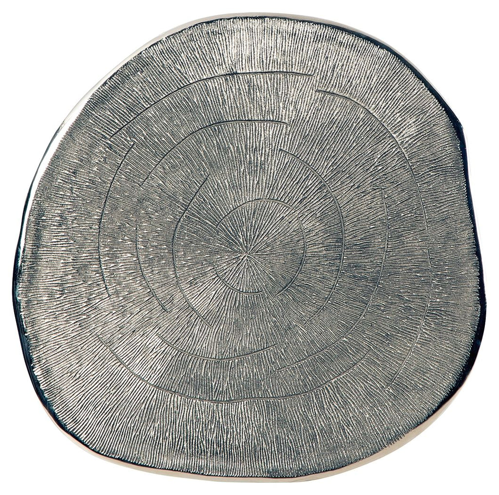 Rich with curated character, this end table puts a contemporary spin on natural beauty. Its irregular grooved top is refined... Rich with curated character, this end table puts a contemporary spin on natural beauty. Its irregular grooved top is refined with the glamour of a gleaming chrome-tone finish. A black base completes this cool piece.Product Features Made with cast aluminum Chrome-tone finish Iron base Base with black finish Laverford - Round End Table - Chrome / Black23.63"W x 25.0"D x 23.75"H - 22.0 lb View more