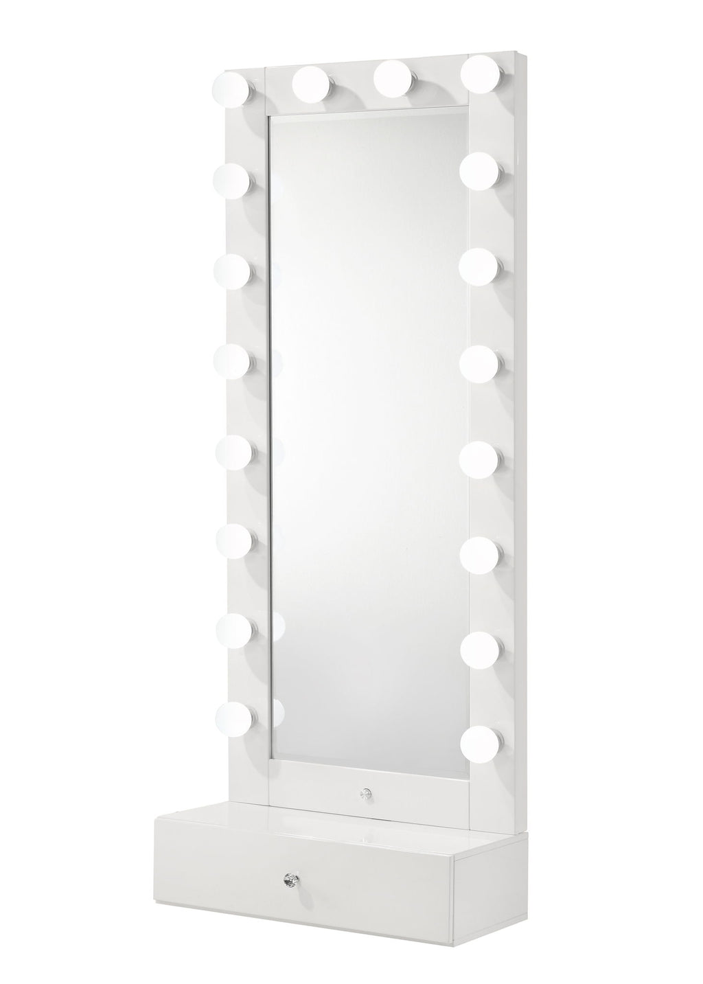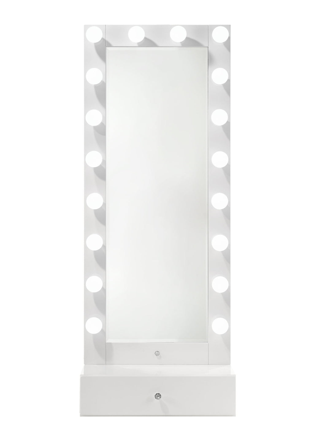 Step into a world of glamour with this sleek and chic vanity set, a perfect fusion of functionality and fashion.... Step into a world of glamour with this sleek and chic vanity set, a perfect fusion of functionality and fashion. Its glossy white finish and clean lines are complemented by the sparkle of a crystal-like knob, adding a touch of sophistication to your personal space. The full length mirror is surrounded by radiant lights, while the ample drawer provides storage for essentials. A perfect spot to check your outfit of the day.Luxo - Tall Lighted Drawer Box Top - White Dimensions 28.74"L x 14.76"D x 7.68"H Weight 28.60 lbs Luxo - Drawer Box - White Dimensions 28.74"L x 2.56"D x 66.93"H Weight 48.40 lbs Product Features LED Hollywood lighting Full length Rotary on/off switch Beveled mirror Full extension Crystal knob View more