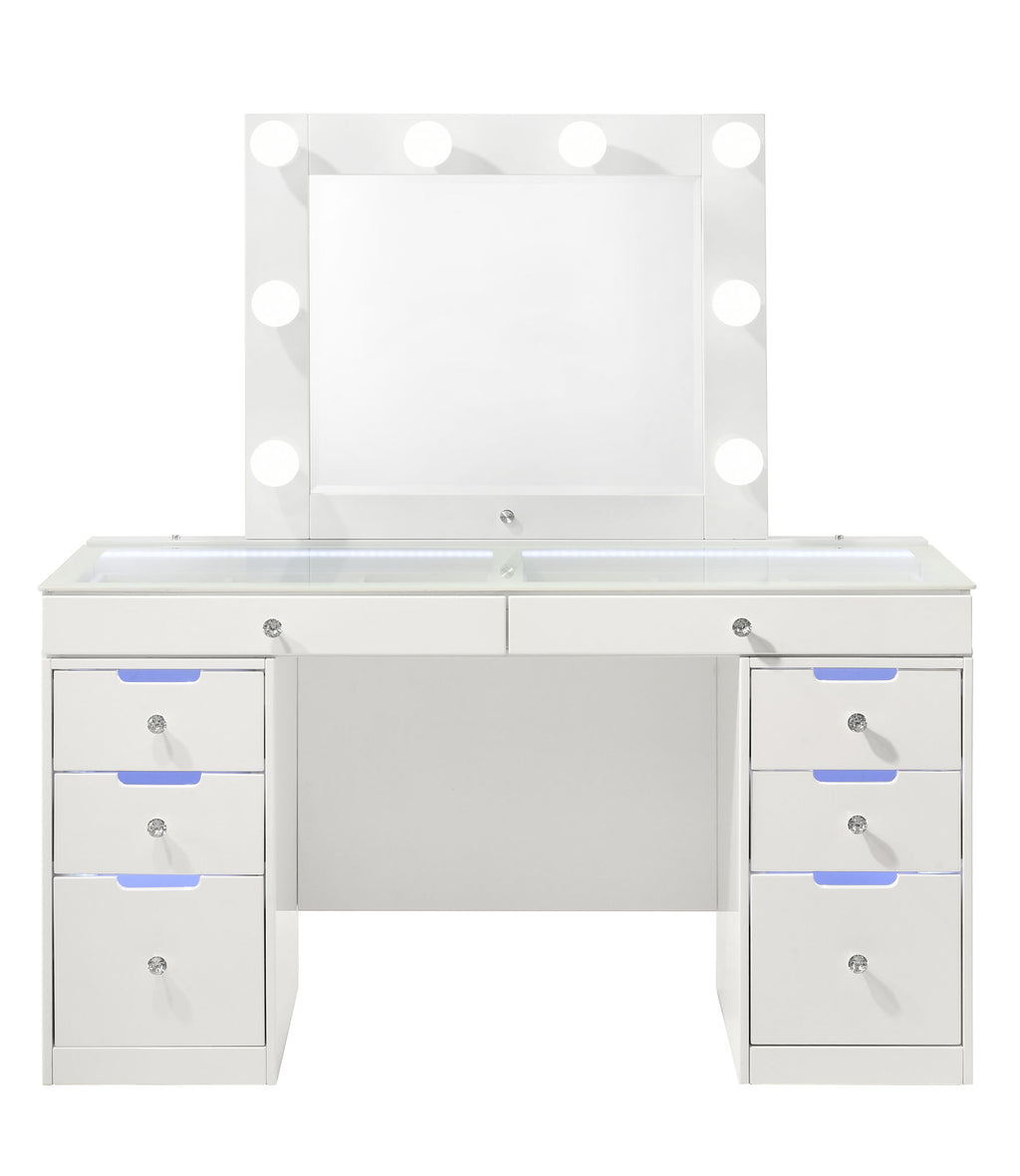 Step into a world of glamour with this sleek and chic vanity set, a perfect fusion of functionality and fashion.... Step into a world of glamour with this sleek and chic vanity set, a perfect fusion of functionality and fashion. Its glossy finish and clean lines are complemented by the sparkle of crystal-like knobs, adding a touch of sophistication to your personal space. The spacious tabletop, graced with a large mirror surrounded by radiant lights, offers an ideal stage for beauty routines, ensuring flawless makeup application under impeccable lighting. With a variety of drawers, this vanity provides ample storage to keep essentials organized and within reach. Interior drawer lighting, integrated outlet, and hidden drawer storage are just some of the included features. Luxo - Vanity Desk - White193.6 lb Luxo - Vanity - White221.1 lb Luxo - Vanity Set - White236.57 lb View more
