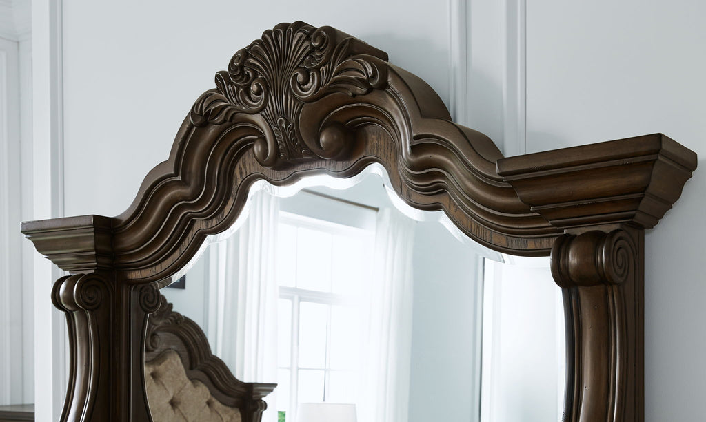 From the ornamental appliques to the large scale, this dresser and mirror make a bold statement. Spacious drawers store your... From the ornamental appliques to the large scale, this dresser and mirror make a bold statement. Spacious drawers store your clothes, jewelry and more in stunning style. The look is timeless. The feel? Right at home.Product Features Includes dresser and mirror Made with hardwood solids, oak and ash swirl veneers, MDF substrates and cast resin components Dark brown finish 6 smooth-gliding drawers with dovetail construction (top drawer felt lined) Drawer pulls with antiqued goldtone finish Mirror attaches to back of dresser View more