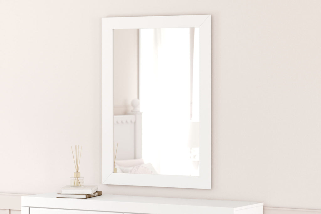 Make getting ready for the day (or bed) that much more magical with this bedroom mirror. Charmingly cute, it appeals... Make getting ready for the day (or bed) that much more magical with this bedroom mirror. Charmingly cute, it appeals to both her sense of playful whimsy and your love for modern design. And the mirror's crisp white finish gives you the versatility to pair it with existing decor.Additional DimensionsAssembled dresser/mirror: 0"Product Features Made with engineered wood (MDF/particleboard/plywood) and decorative laminate for the right balance of affordability and durability Matte white finish Decorative laminate replicates natural or man-made material surfaces with consistent color, pattern and texture can be attached to back of dresser or wall mounted horizontally or vertically Mollviney - Bedroom Mirror - White41.85"W x 1.3"D x 30.67"H - 24.0 lb View more