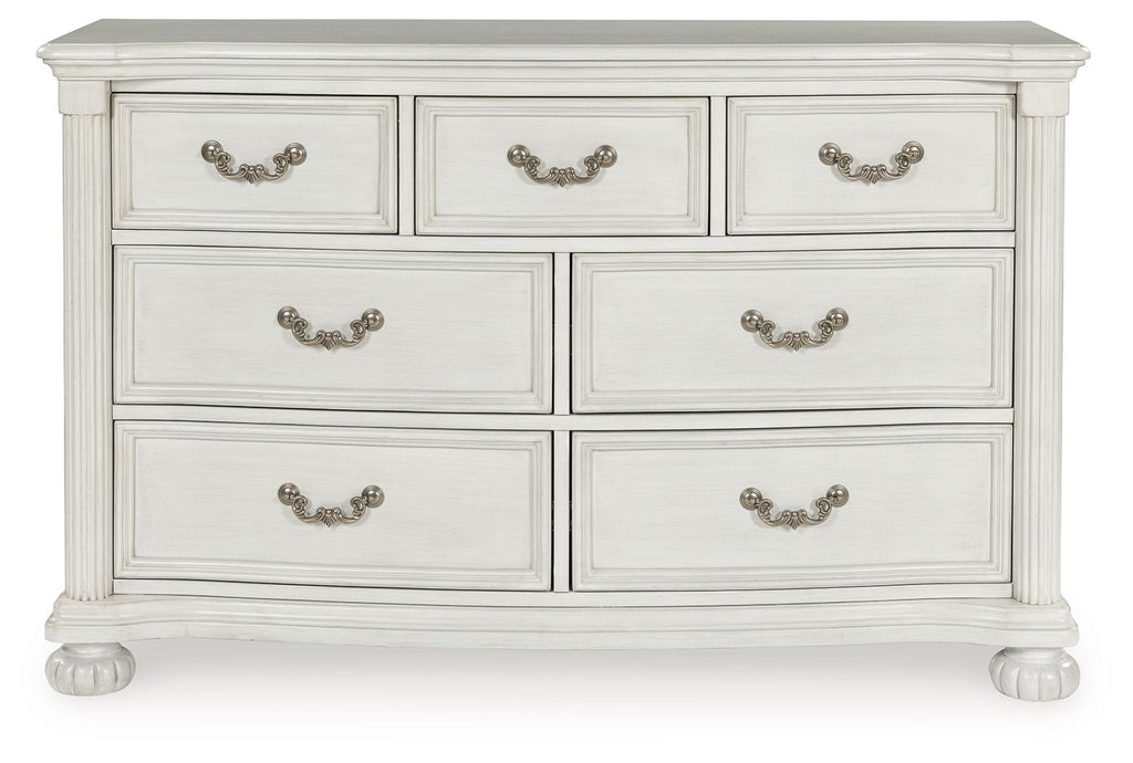 Transform your inner sanctum into a haven of timeless elegance and functionality. This traditionally styled dresser is adorned in a... Transform your inner sanctum into a haven of timeless elegance and functionality. This traditionally styled dresser is adorned in a classic antiqued white finish, highlighted by a serpentine-shaped front with thick decorative moulding. Its drawers are packed with ample storage possibilities. And did we mention the stylish reeded bun feet? Talk about relaxed refinement.Additional Dimensions Top side drawer interior (lined) (2): 0" Top center drawer interior (lined): 0" Middle and bottom drawer interior (4): 0" Product Features Made with hardwood solids, veneer and MDF substrate with cast resin components Antiqued white finish Metal pulls with polished pewter-tone finish 7 smooth-gliding drawers with fully finished interiors Drawer with French/English dovetail construction and heavy-duty ball-bearing side glides (top drawers felt lined) Thick decorative moulding Reeded bun feet Montelaine - Dresser - Antique White60.25"W x 18.13"D x 37.63"H - 225.0 lb View more