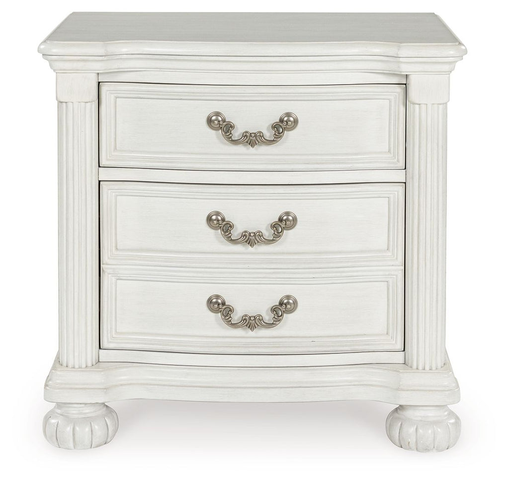 Transform your inner sanctum into a haven of timeless elegance and functionality. This traditionally styled nightstand is adorned in a... Transform your inner sanctum into a haven of timeless elegance and functionality. This traditionally styled nightstand is adorned in a classic antiqued white finish, highlighted by a serpentine-shaped front with thick decorative moulding. Its drawers are packed with ample storage possibilities, and a hidden pull-out tray behind the bottom drawer puts your small valuables out of sight. And did we mention the stylish reeded bun feet? Talk about relaxed refinement.Additional Dimensions Top drawer interior (lined): 0" Center drawer interior (lined): 0" Bottom drawer interior: 0" Product Features Made with hardwood solids, veneer and MDF substrate with cast resin components Antiqued white finish Metal pulls with polished pewter-tone finish 2 smooth-gliding drawers with fully finished interiors Drawers with French/English dovetail construction and heavy-duty ball-bearing side glides (pull-out tray and top drawer felt lined) Pull-out tray behind bottom drawer Thick decorative moulding Reeded bun feet Montelaine - Three Drawer Night Stand - Antique White29.0"W x 18.13"D x 27.75"H - 90.0 lb View more