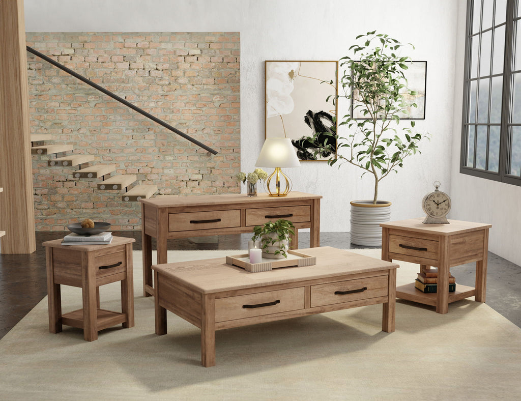 1 Drawer End Table. The Natural Parota occasional tables are a splendid furniture addition that brings an air of sophistication to any living room or entertainment area. Their elegant design is sure to leave a lasting impact, and their organic aesthetics make them versatile enough to harmonize with a wide range of home decor styles and color schemes.