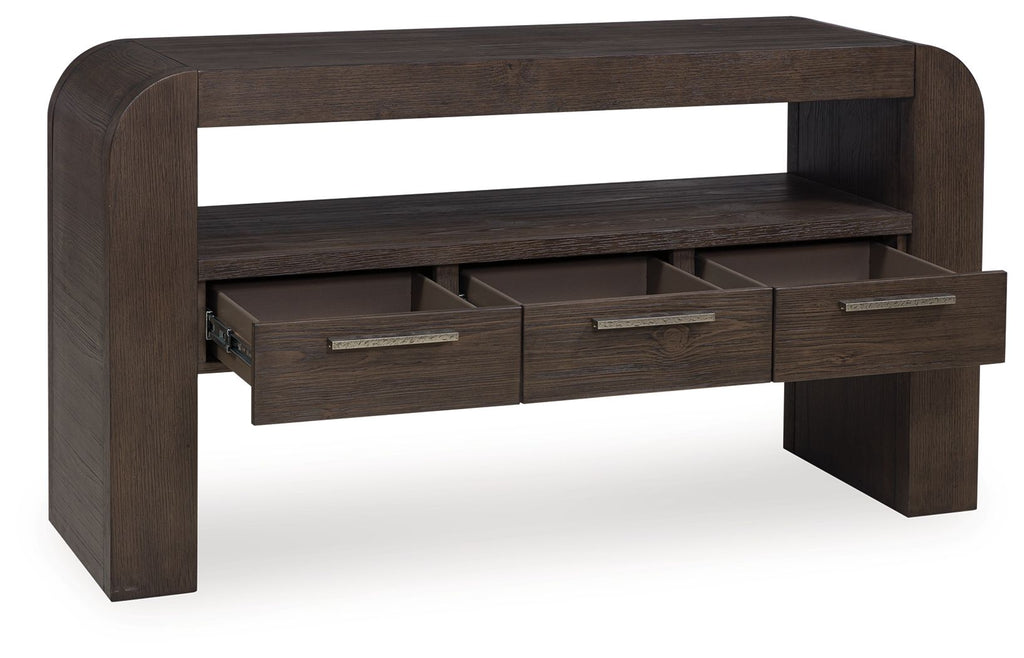Elevate the everyday with this console table. A rich medium brown finish brings added flexibility, complementing a variety of casual... Elevate the everyday with this console table. A rich medium brown finish brings added flexibility, complementing a variety of casual contemporary color schemes. Rounded corners soften the look. Drawers invite miscellaneous storage, while the open shelf encourages you to dress it up with decorative details. Adding chic sofa-side form and function, this console lends an approachably luxe vibe to your space.Product Features Made with solid wood components, thick spruce veneer and MDF substrate Rich medium brown wood-tone finish Open shelf 3 smooth-gliding drawers with fully finished interiors, English dovetail construction and premium undermount drawer glides with soft-close function Assembly required Neo - Console - Rich Brown60.0"W x 18.0"D x 32.75"H - 173.8 lb View more
