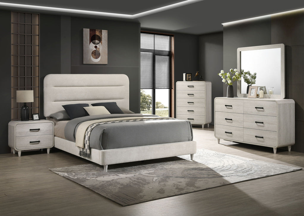 Transform your bedroom into a serene retreat with this contemporary ensemble, where modern sophistication meets luxurious comfort. Featuring sleek lines... Transform your bedroom into a serene retreat with this contemporary ensemble, where modern sophistication meets luxurious comfort. Featuring sleek lines and a neutral palette, this group exudes elegance and versatility, perfect for any home decor. The centerpiece boasts a plush, upholstered design that invites relaxation, while matching storage solutions combine practicality with style. Elevate your living space with this harmonious blend of function and aesthetic appeal.Product FeaturesRounded corners Nyomi - Dresser Top - White43.5"W x 1.0"D x 37.4"H - 28.1 lb View more