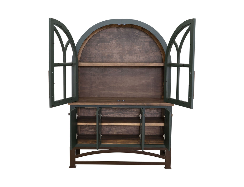 6 Door, Hutch. The Obsidian Hutch is a stunning piece of furniture inspired by the elegant designs of mid-18th-century French... 6 Door, Hutch. The Obsidian Hutch is a stunning piece of furniture inspired by the elegant designs of mid-18th-century French furniture. It seamlessly combines the timeless allure of old-world charm with the sleek lines of contemporary design, making it a perfect addition to any dining area. Expertly crafted from high-quality solid pine and okume wood, this buffet and hutch feature two stylish arched glass doors, adding a touch of sophistication to your living space.Product Features Crafted of solid pine and okume wood. Multi-step lacquer in a green teal finish. Mortise and tenon construction offer stability and durability. Two arched glass doors with magnetic catches. The metal base undergoes meticulous hand-cutting and welding and is then coated with a unique electrostatic paint to enhance its durability and resistance to corrosion. Custom metal pulls. Obsidian - Hutch - Green / Brown48.5"W x 17.75"D x 70.5"H - 157.0 lb View more