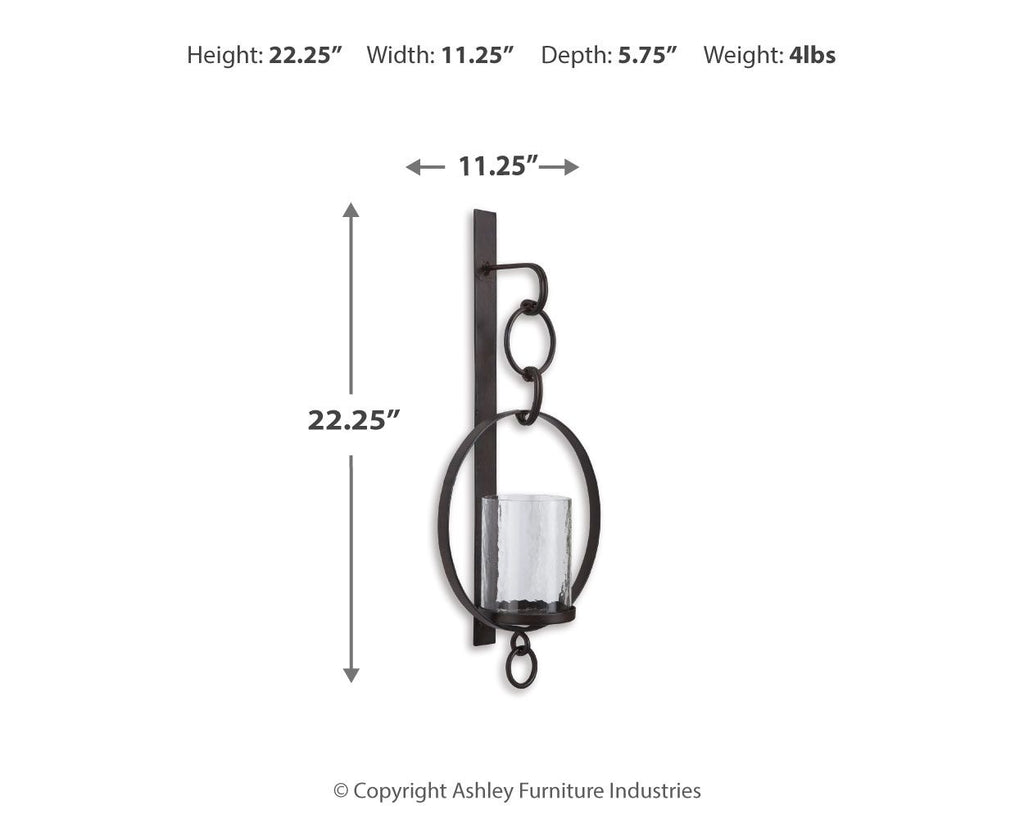 Hang out in style. Bring warmth and flair to an overlooked space with this wall sconce and candle holder. Dark... Hang out in style. Bring warmth and flair to an overlooked space with this wall sconce and candle holder. Dark bronze-tone metal and clear glass make a striking combination. Aligned or staggered, they’re even more beautiful when paired.Additional DimensionsGlass hurricane: 0"Product Features Made of bronze-tone metal with clear glass shade Holds pillar candle (not included) Keyhole bracket hanger Clean with a soft, dry cloth Ogaleesha - Wall Sconce - Brown11.25"W x 5.63"D x 22.13"H - 6.0 lb View more