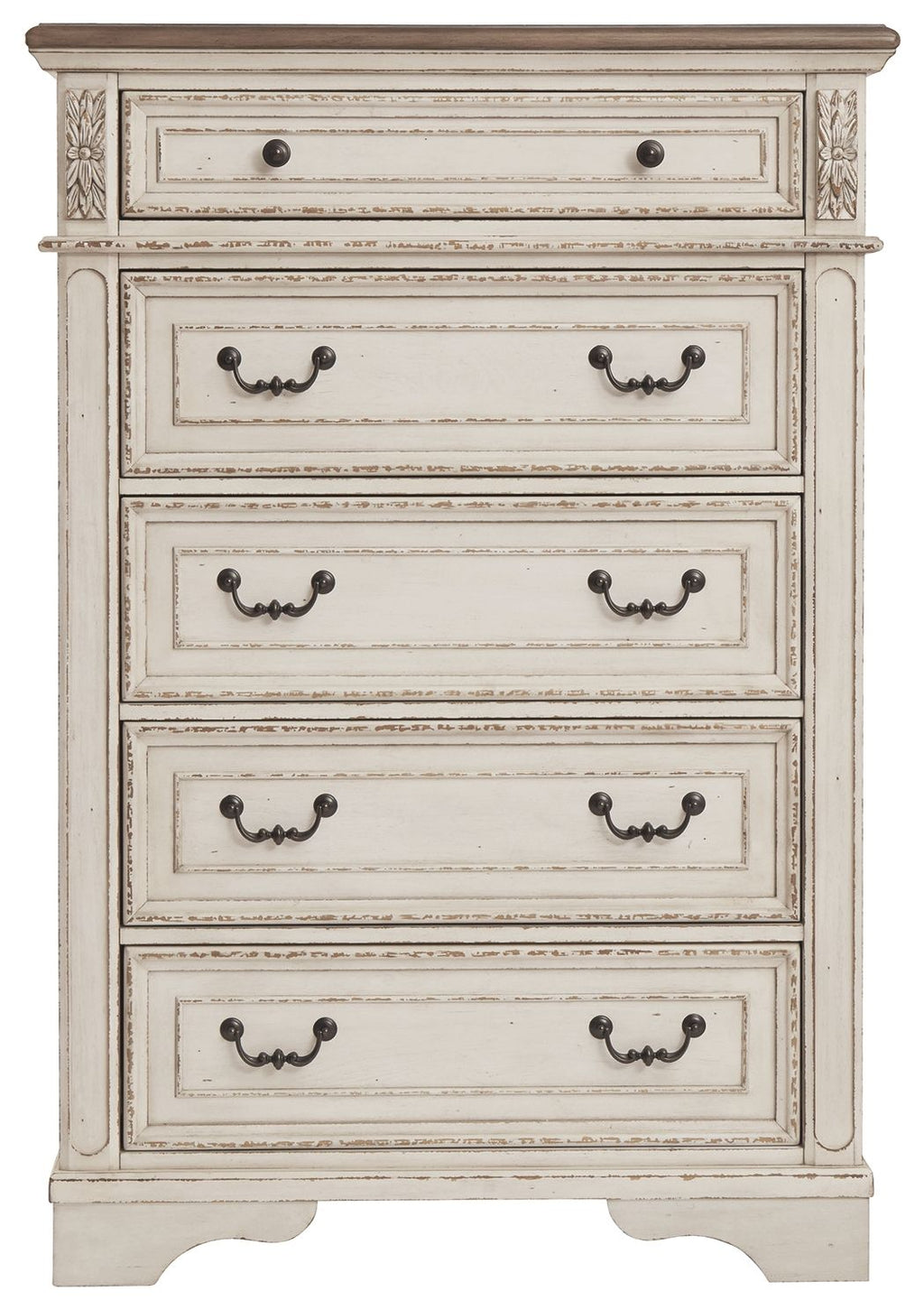Elevating the art of traditional cottage styling, this chest of drawers is your dream bedroom retreat realized. Its antiqued two-tone... Elevating the art of traditional cottage styling, this chest of drawers is your dream bedroom retreat realized. Its antiqued two-tone aesthetic blends a chipped white with a distressed wood finished top for added charm. Framed drawer fronts and decorative corbels add refinement, while bail pulls in a dark bronze-tone finish lend a classic touch.Additional Dimensions Top drawer interior (lined): 0" Bottom drawer interior (4): 0" Product Features Made of veneers, wood and engineered wood, with cast resin components Antiqued two-tone finish Dark bronze-tone finished metal hardware 5 smooth-gliding drawers with dovetail construction Includes tipover restraint device Small Space Solution Includes tipover restraint device Realyn - Five Drawer Chest - White / Brown / Beige40.13"W x 18.13"D x 58.13"H - 211.0 lb View more