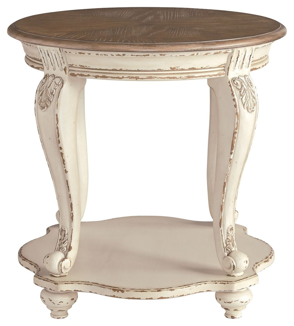 Elevating the art of traditional cottage styling, this round end table is sure to serve you beautifully for years to... Elevating the art of traditional cottage styling, this round end table is sure to serve you beautifully for years to come. Antiqued two-tone aesthetic blends a chipped white with a distressed wood finished top for added charm. Classic cabriole legs and shapely lower shelf are a lovely twist. Decorative corbels add refinement.Additional DimensionsOpening: 0"Product Features Made of ash veneer, wood and engineered wood, with cast resin components Antiqued two-tone finish Fixed lower shelf Assembly required Realyn - Round End Table - White / Brown26.0"W x 26.0"D x 25.88"H - 37.0 lb View more